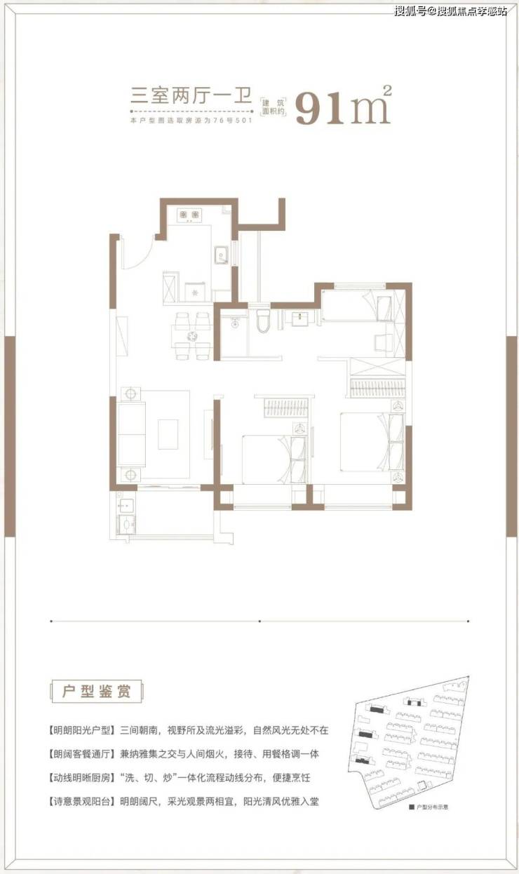 建面约91㎡3房2厅1卫户型,做到了三开间朝南+双朝南卧室带飘窗+动静分离+卫生间干湿分离,采光面拉到极致的小3房户型。