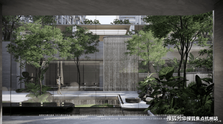 下沉式庭院,通过垂直景墙、悬浮观景台与叠水景观的立体交织,实现移步换景的视觉效果,也与会所空间形成无界交互。