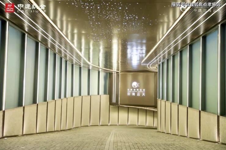从地库迎宾入口、星空顶、到双入户大堂,香槟金满天星铝板搭配星光灯,两侧墙体还设置了玻璃幕镶嵌灯柱,墙面也采用了拼接米色系星云石,归家场景显得恢弘大气