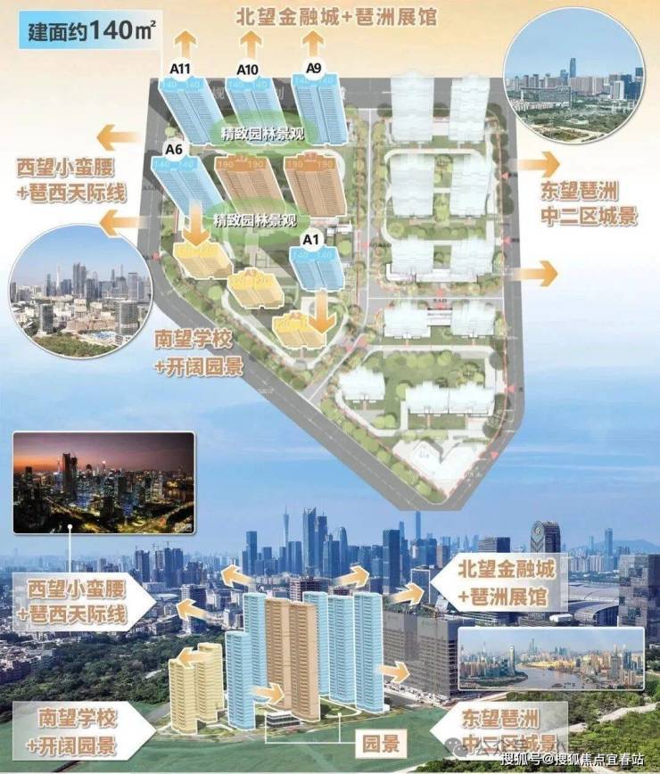 建面140平四房三卫,面宽16米,专梯入户,独立电梯厅,客厅面宽约5米,双主套三卫设计,U型厨房,140平主要分布在北侧后排高层,北边可望琶洲CBD景观,总价1000万起。