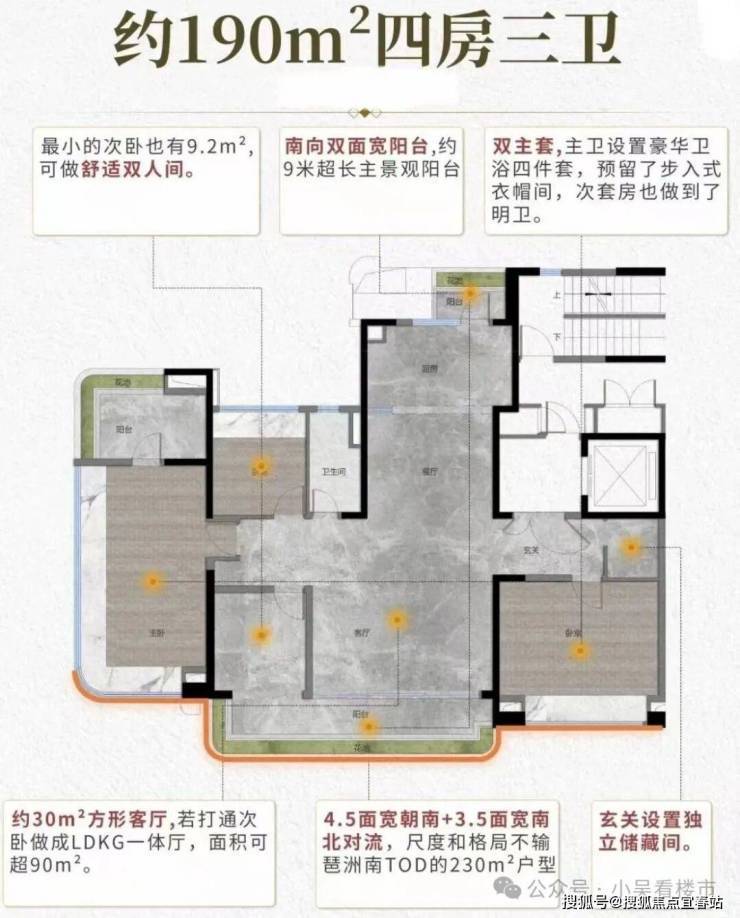 建面120平四房两卫,南北对流双阳台,面宽约15米,专梯专户,酒店式主卧套房带步入式衣帽间,带有L型飘窗,最小卧室7.9平,4.9米宽的客厅,目前这个户型以及卖完了,二期会有三栋120平的,但是现在限制新规,不知道户型会不会变。