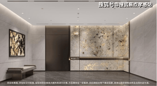 高定地下入户大堂,延续首层入户大堂材质高标,精选雪山银狐天然透光奢石,营造精奢生活质感。