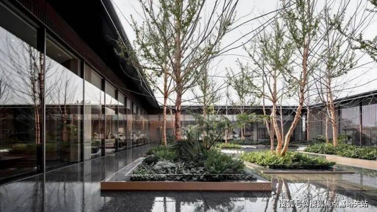 大量美国鲑鱼粉河桦树阵为主体的水上森林,与林下的金钱草、迷迭香、笔筒树等植被交相呼应,形成极富特色的前场景观。廊中水景树阵的设计,营造出丰富的景观空间,增添业主归家的仪式感。