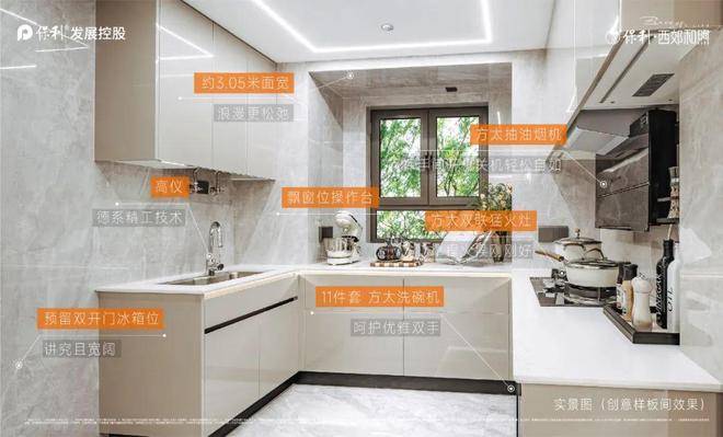 U型厨房带飘窗的设计,左侧预留了双开门冰箱位置,让整个空间的利用率更高。☑️☑️保利西郊和煦售楼处电话:400-8787-740☑️☑️