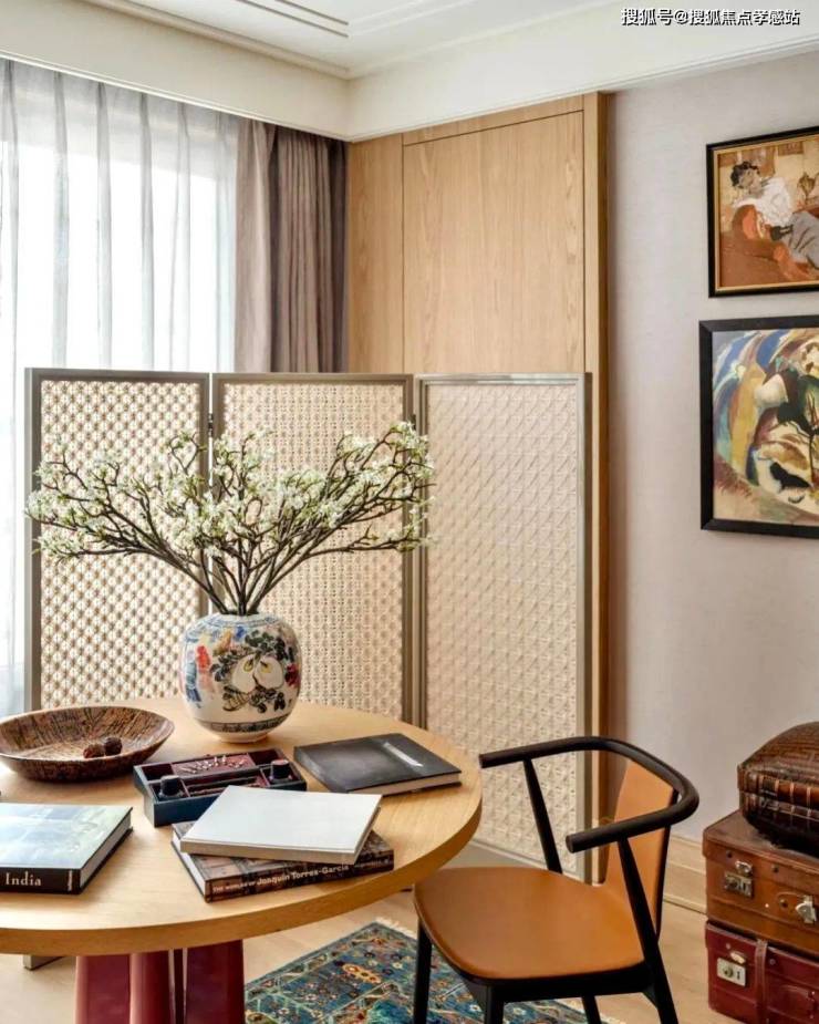 多功能书架彰显着设计的巧思,形成有如博物馆般的展示方式,即可放置日常读物,亦可展示珍本藏书。同时,利用屏风做隔断,与圆桌结合形成私密空间。