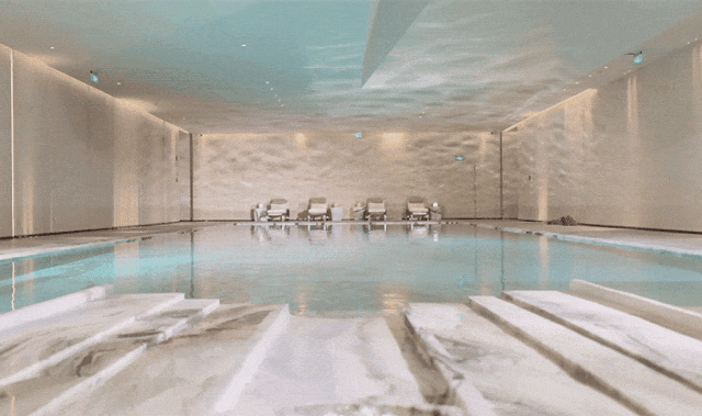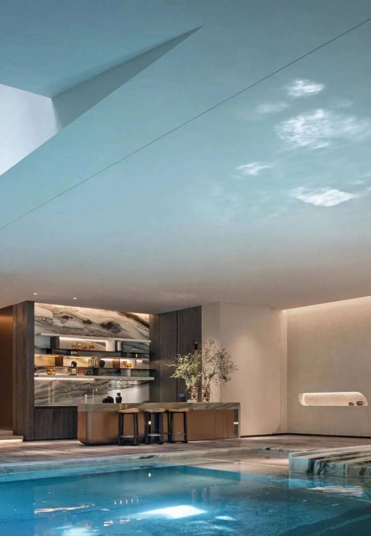 若行至会所泳池,便更加松弛下来,大地色系墙面,粗粝的质感配以水波的潋滟光影,更显轻快,加之立体开口的天窗设计,将天光引入,自然悦动。