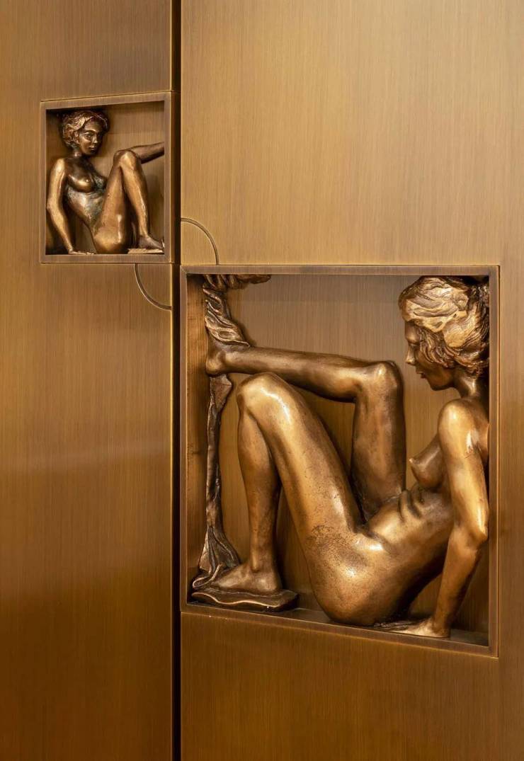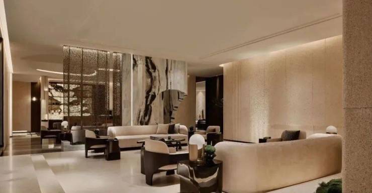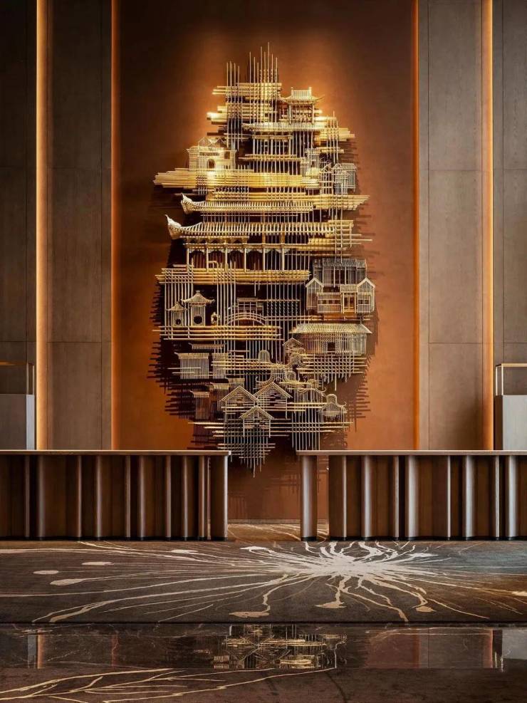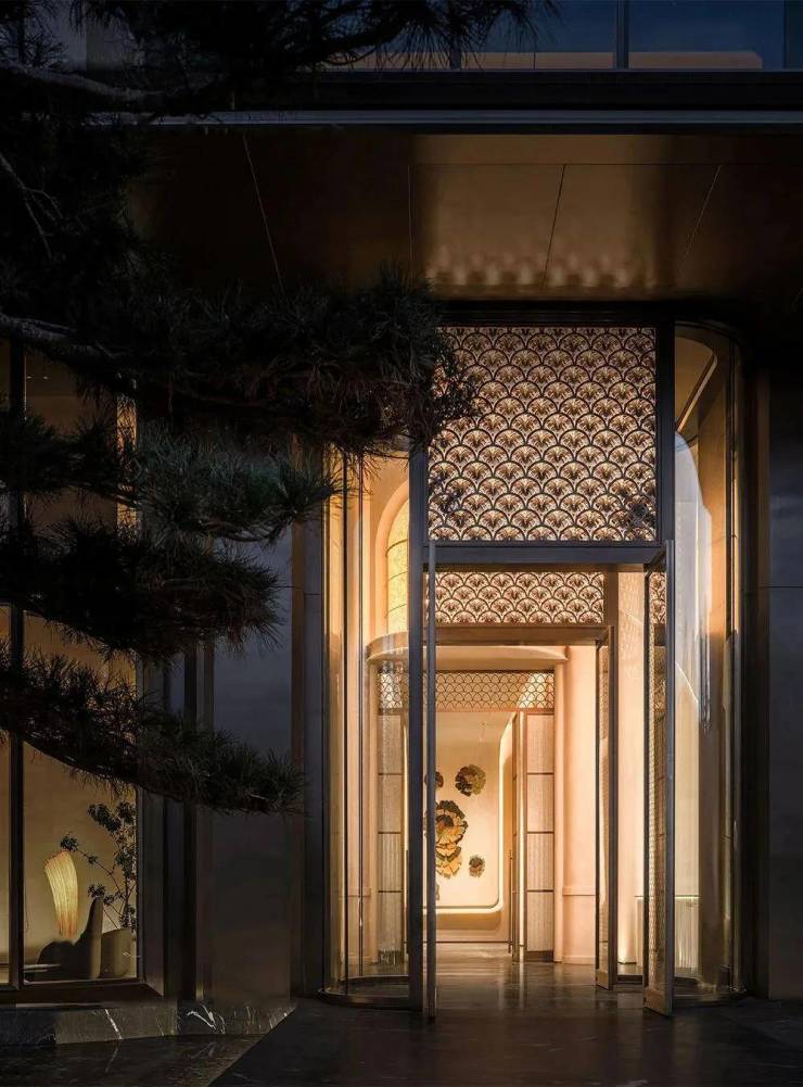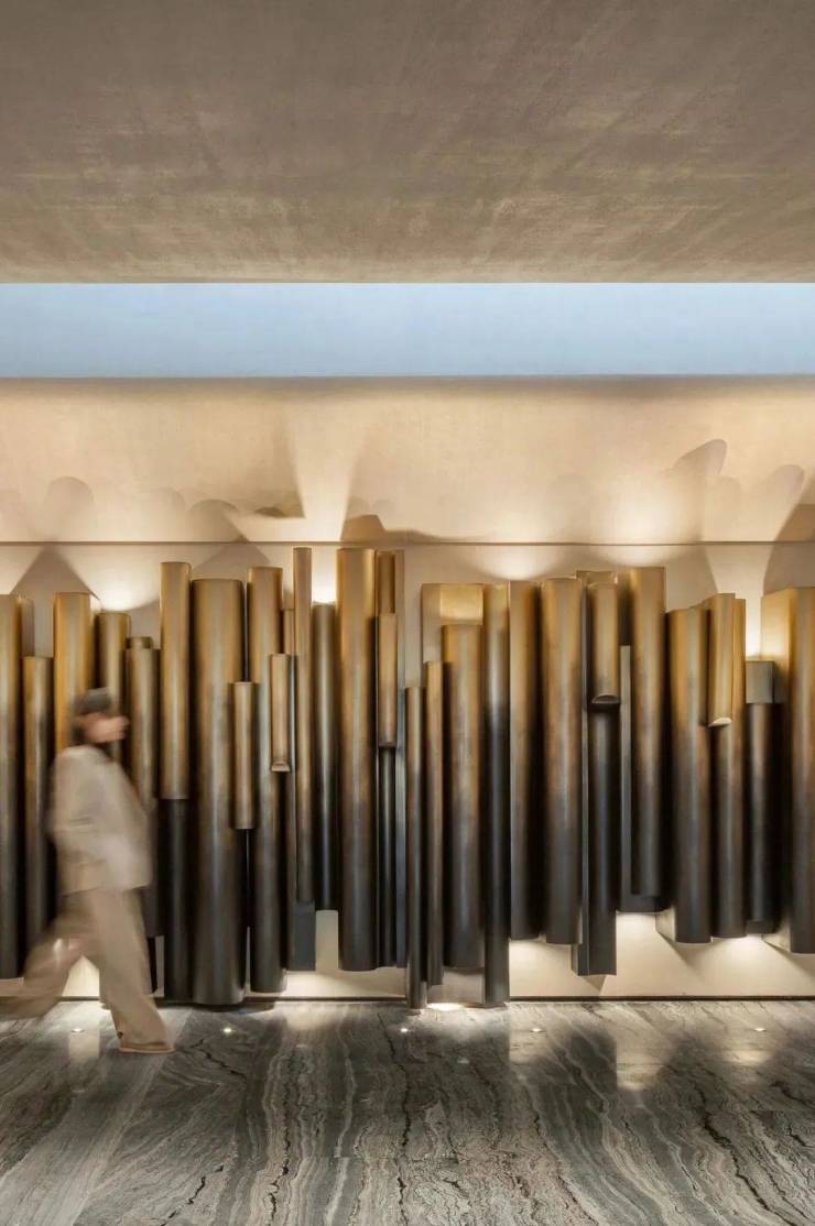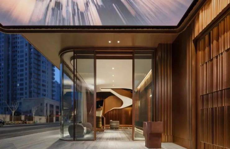 迎宾大堂具有现代感全景落地玻璃幕墙,在光影的映照下,为空间增添了一份神秘与浪漫。古铜材料环绕着整个一层空间,在古朴质感中找到现代的对称。