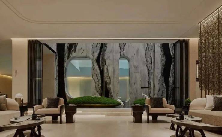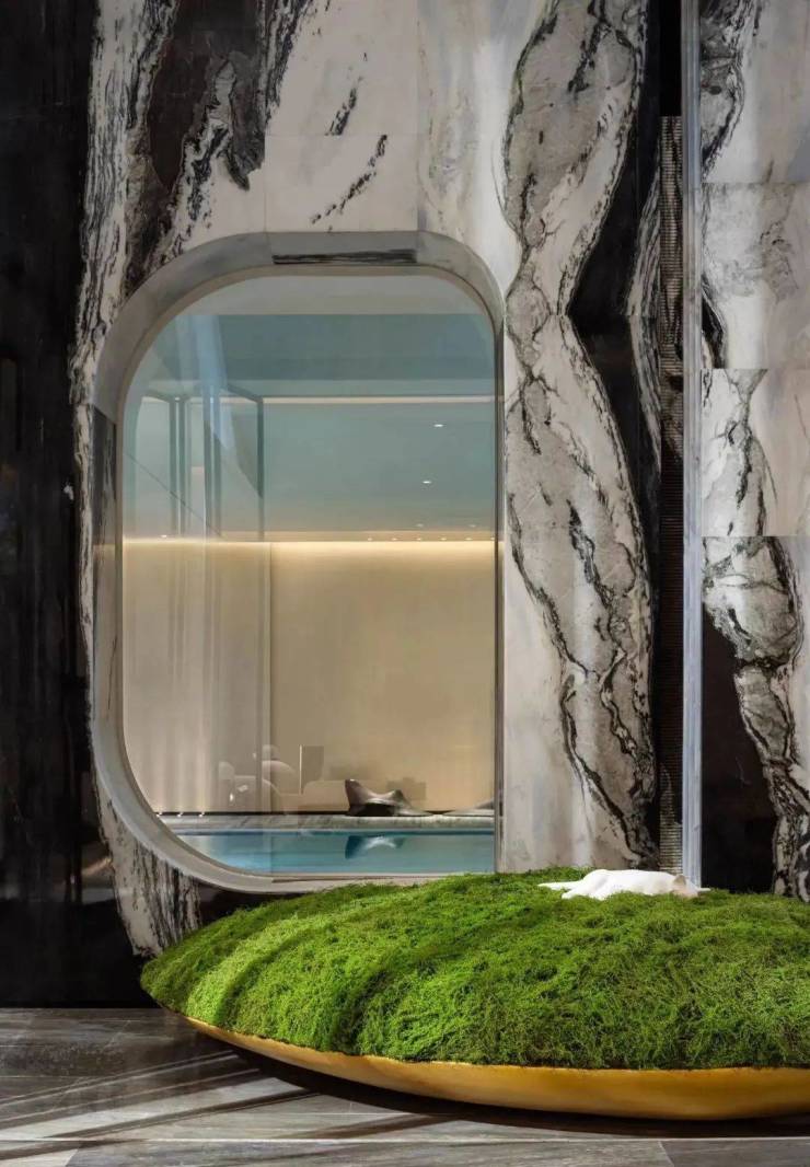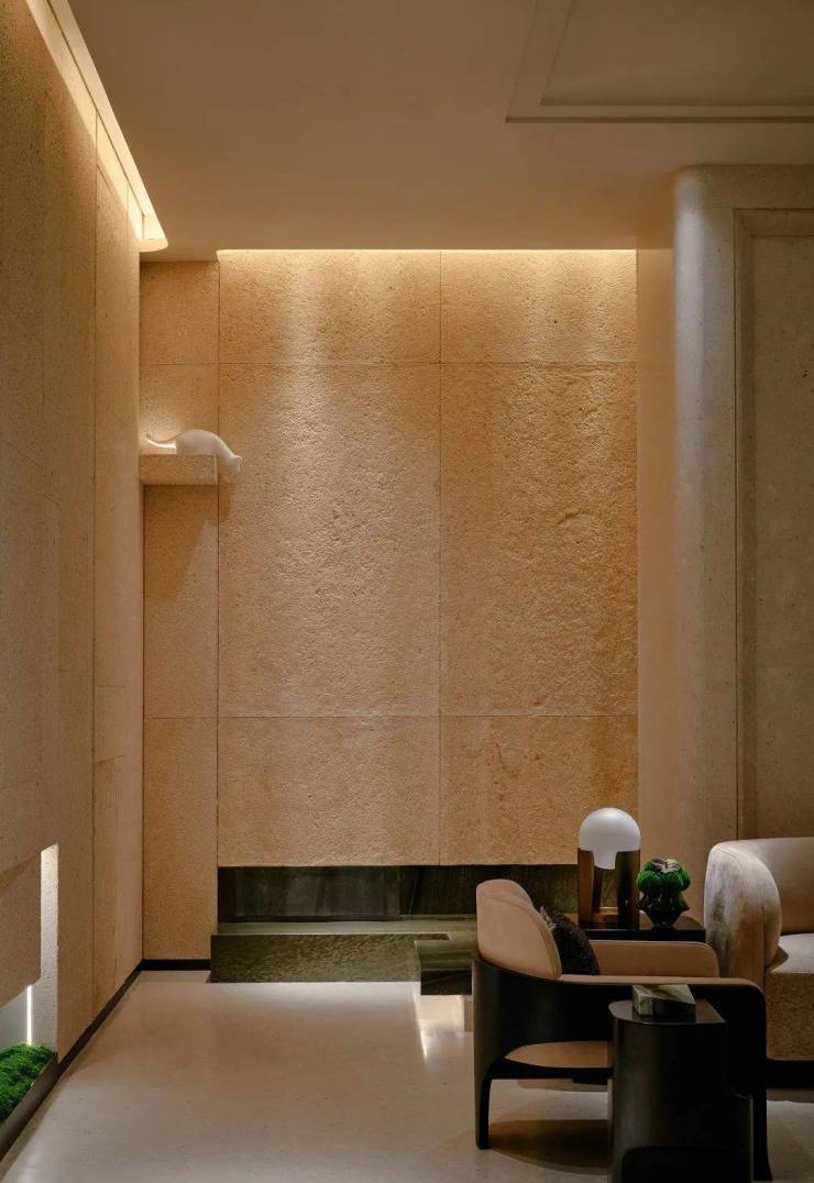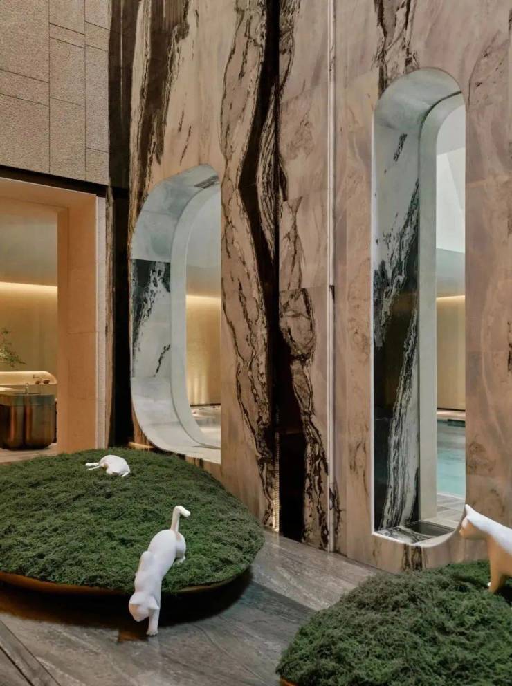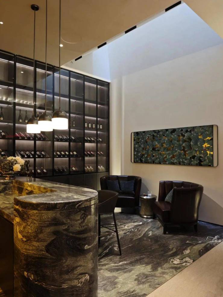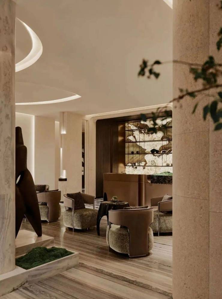 休闲吧以一方转角熊猫白石材体块分隔空间,其纹络如同水波流淌下来,加之中空的圆拱造型,犹如游园中遇水、遇山、遇洞穴,而其后的屏风则像藤蔓般垂直而下,生长开来。