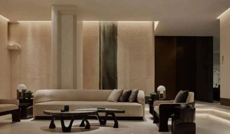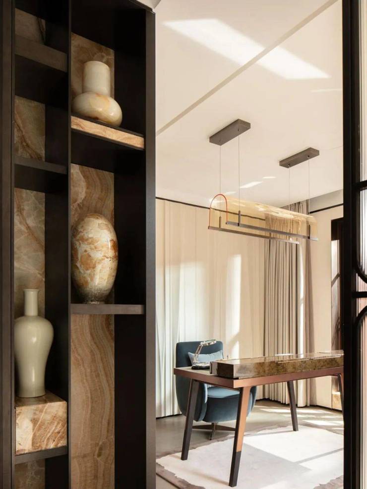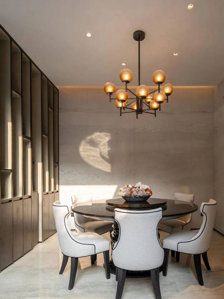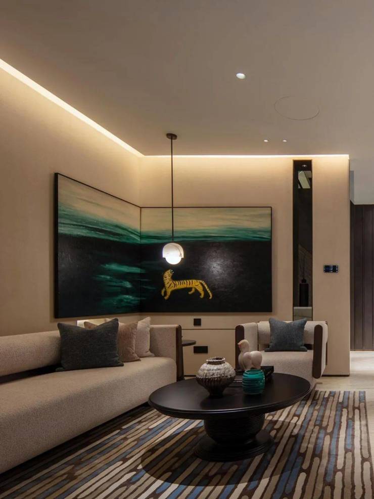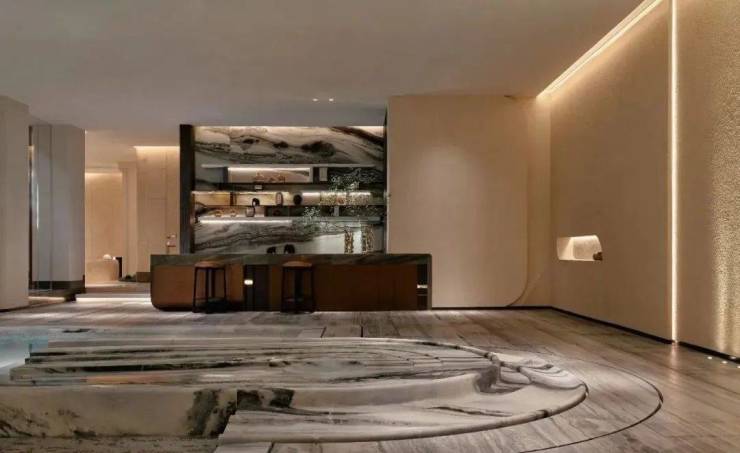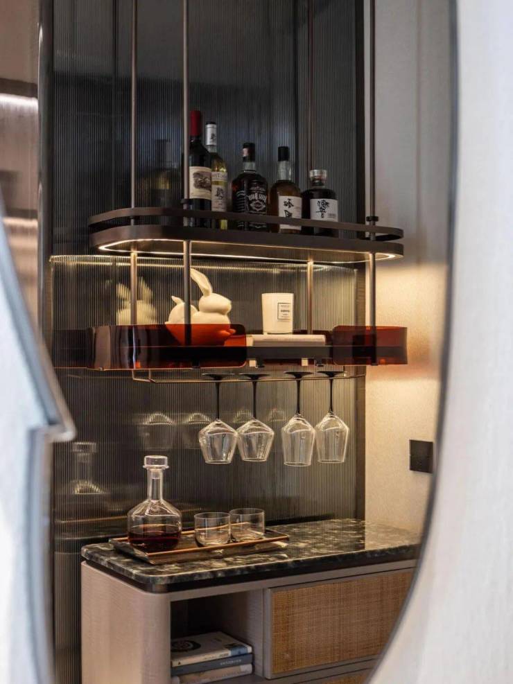吧台酒柜的奢石背景墙更透出云影光晕,流线型沙发与几岸亦如浮动般自在,一切皆为“灵的空间”添上一笔心意。