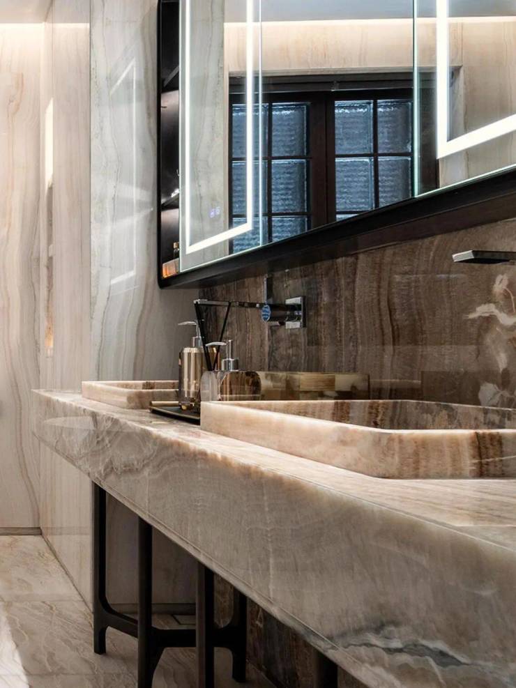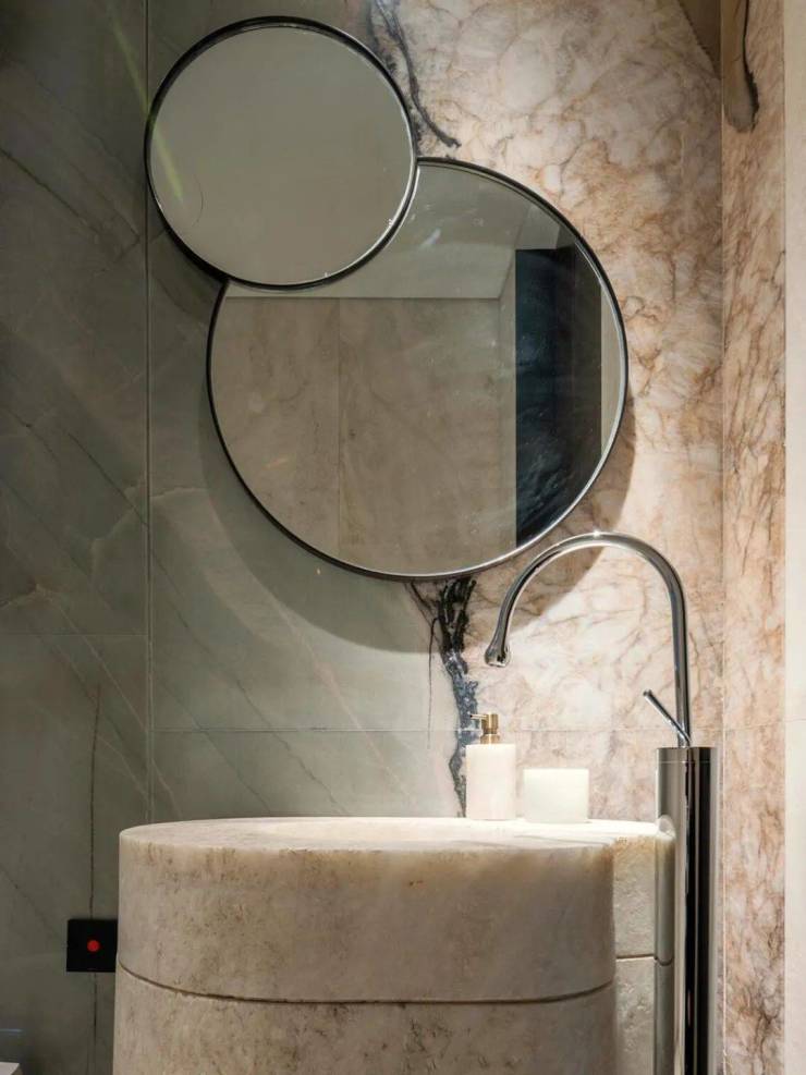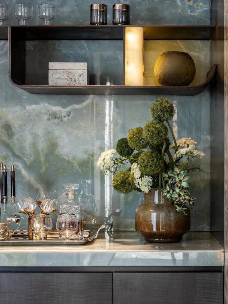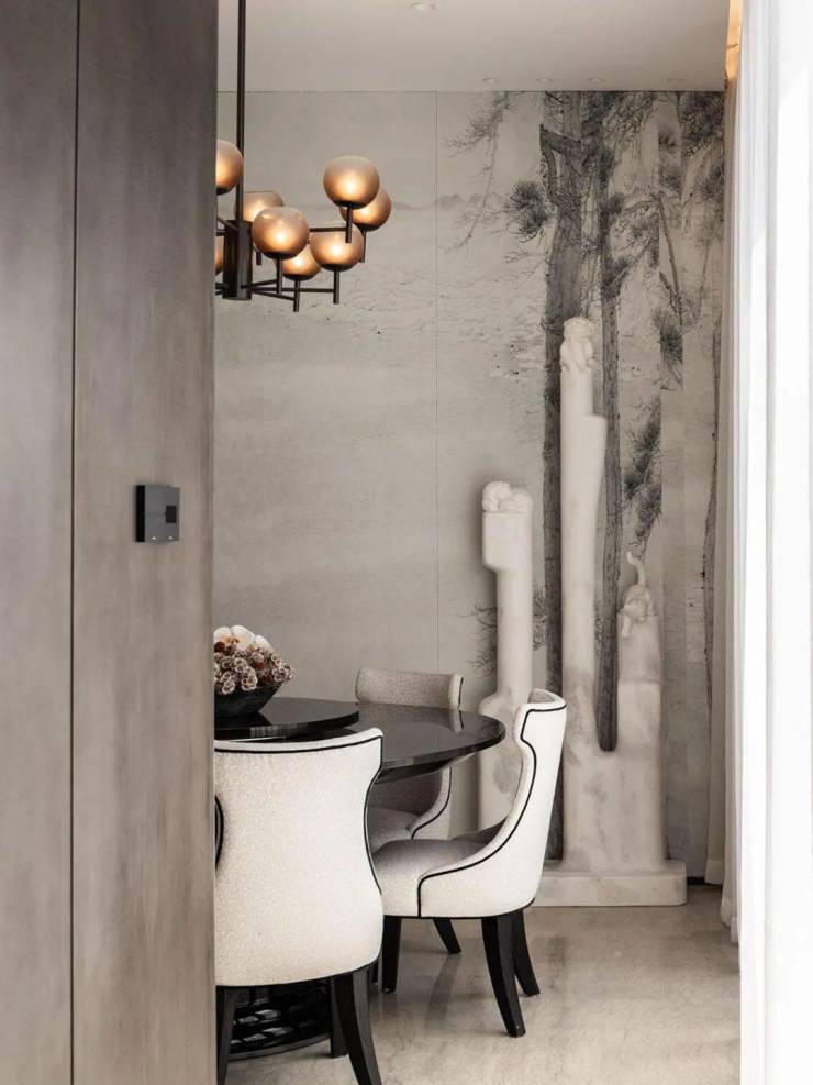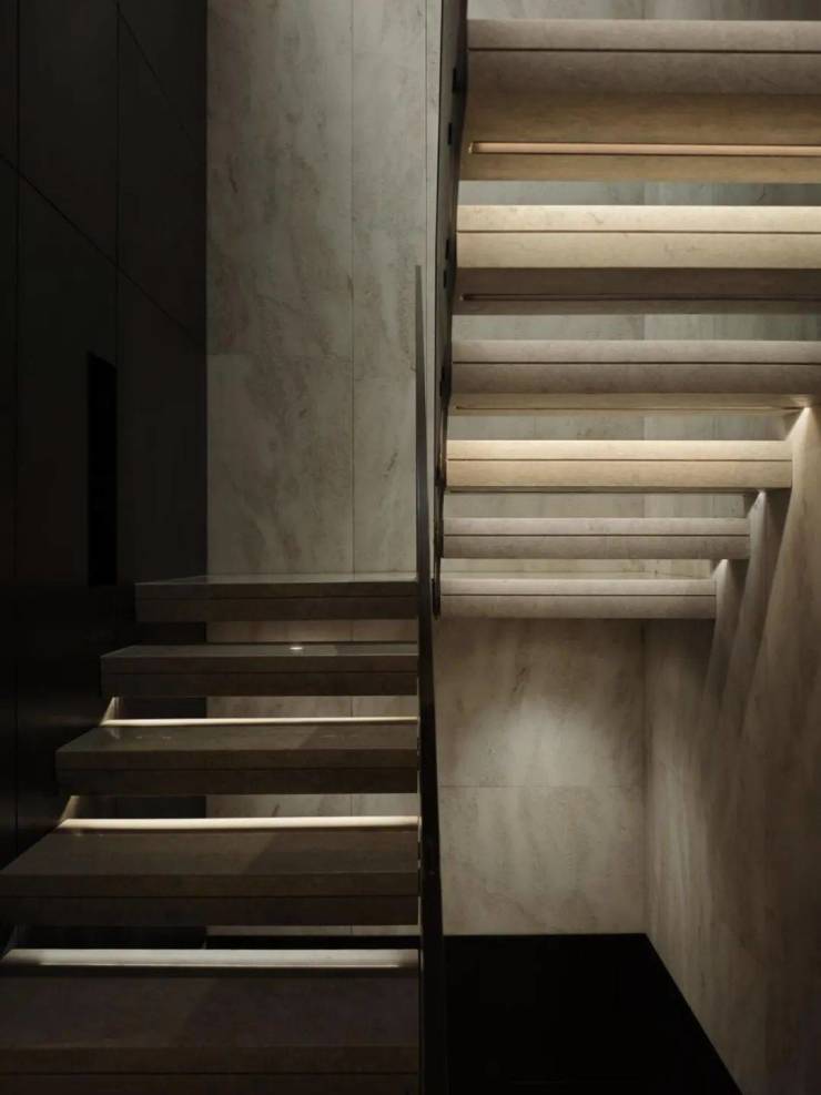 吧台酒柜的奢石背景墙更透出云影光晕,流线型沙发与几岸亦如浮动般自在,一切皆为“灵的空间”添上一笔心意。