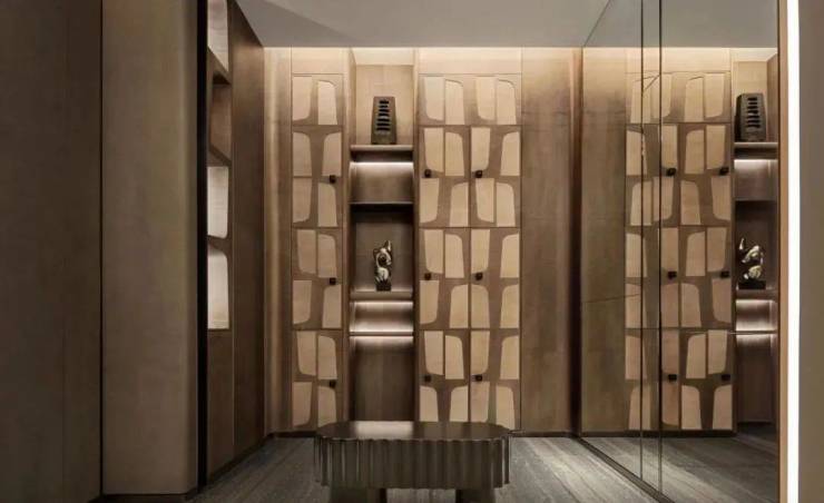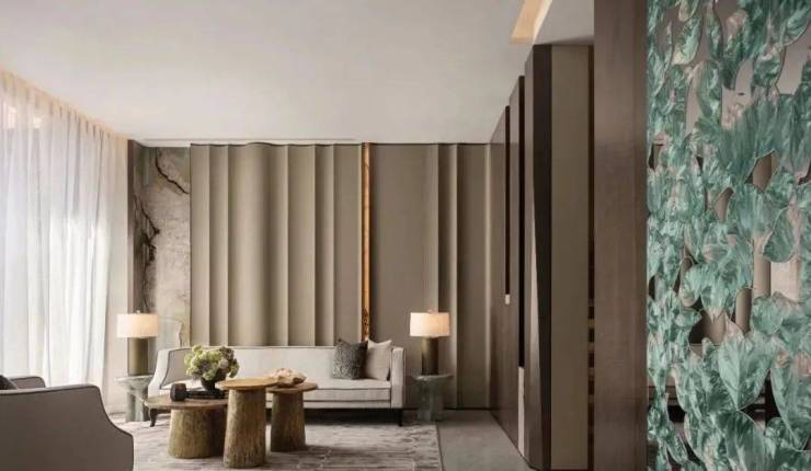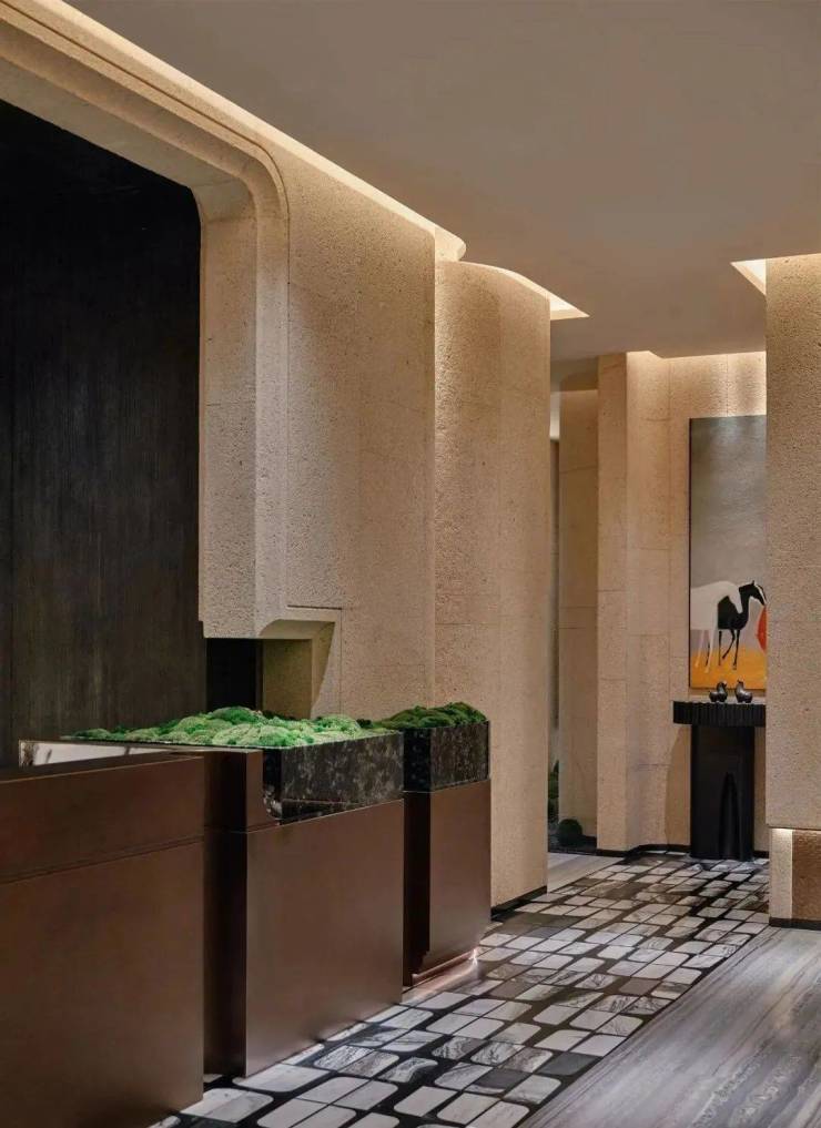私宴厅则显得私密隐世,立体起伏的墙面凸显出自然拙朴气息,弧形边角展示温柔力,墨绿与棕的色彩搭配,造就放松氛围。