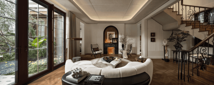 风貌别墅因历史形态限制,采光常受局限。保利·外滩序突破市面上风貌别墅的面宽局限,餐客厅约9.4米面宽,开阔的采光面搭配大面积玻璃窗,还能将室外的花园景致更好地引入室内,实现室内外景观的无界互通。