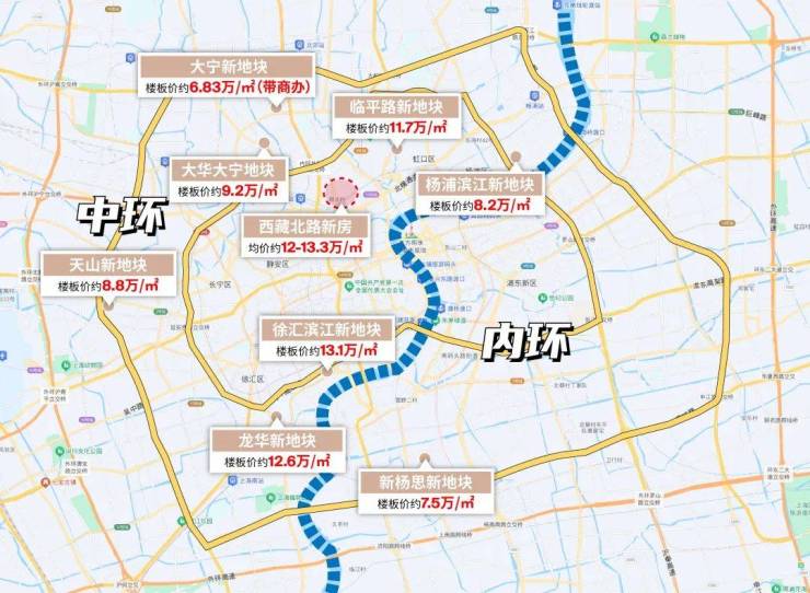 整个中环未来的新房均价起步约12万/㎡+,像大宁这样的明星级中环板块,起步价更是约16万+。