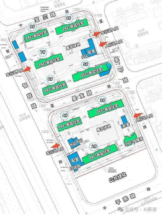 根据设计方案显示,项目拟建6栋层高14F和2栋层高16F商品住宅,1栋层高17F的保障房,网传可售房源约550套+。