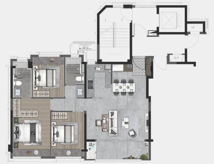 客餐厅阳台一体化,公区方正无比,视野开阔,尺度阔绰,将业主的非凡气度体现的淋漓尽致!