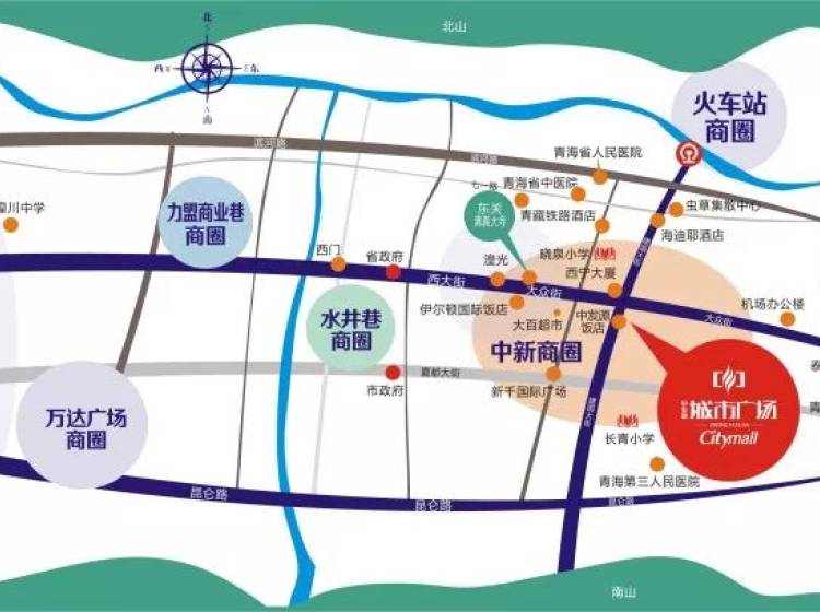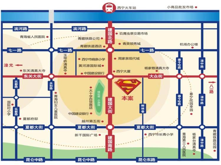 大型商场:大十字百货大众店、新千国际广场 银行:中国建设银行、青海银行、西宁农商银行 学校:东关女子回族小学 酒店餐饮:中发源饭店、黄河源假日酒店、青藏假日饭店 医院:西宁市铁路医院 火车站:西宁火车站向正北方向步行10分钟即到 中发源饭店为项目自带配套