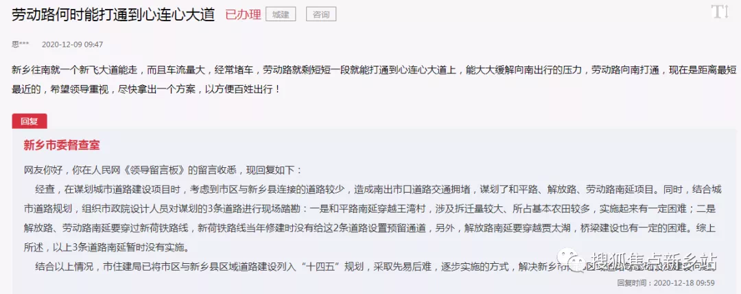 对此,新乡市委督查室回复:在谋划城市道路建设项目时,考虑到市区与新乡县连接的道路较少,造成南出市口道路交通拥堵,谋划了和平路、解放路、劳动路南延项目。