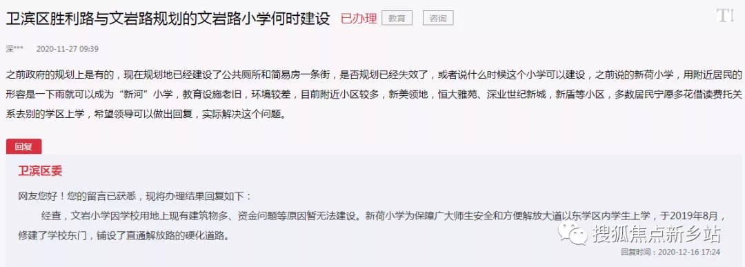 对此,卫滨区委回复:文岩小学因学校用地上现有建筑物多、资金问题等原因暂无法建设。新荷小学为保障广大师生安全和方便解放大道以东学区内学生上学,于2019年8月,修建了学校东门,铺设了直通解放路的硬化道路。丰华街纺织路片区教育用地规划2020年8月28日,新乡市规划局发布《牧野大道与科隆大道西北角区域控制性详细规划调整》,其中就包含新飞冷柜厂旧改项目(西地块),该地块调整后将新增36班小学,居住用地和幼儿园用地。