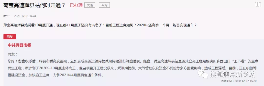 对此,中共辉县市委回复:荷宝高速辉县站互通式立交工程是解决新乡西出口“上下难”的重点民生工程,原计划于2020年10月底主体完工,但自项目开工建设以来,受汛期提前、大气管控以及资金不到位等多方因素影响,造成工程滞后。目前,正在积极筹措建设资金,加快施工进度,力争2021年4月底具备通车条件。