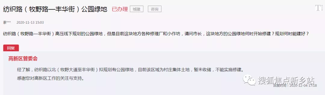 对此,高新区管委会回复:纺织路以北(牧野大道至丰华街)拟规划有公园绿地,目前该区域为村庄集体土地,暂未收储,不能实施修建。