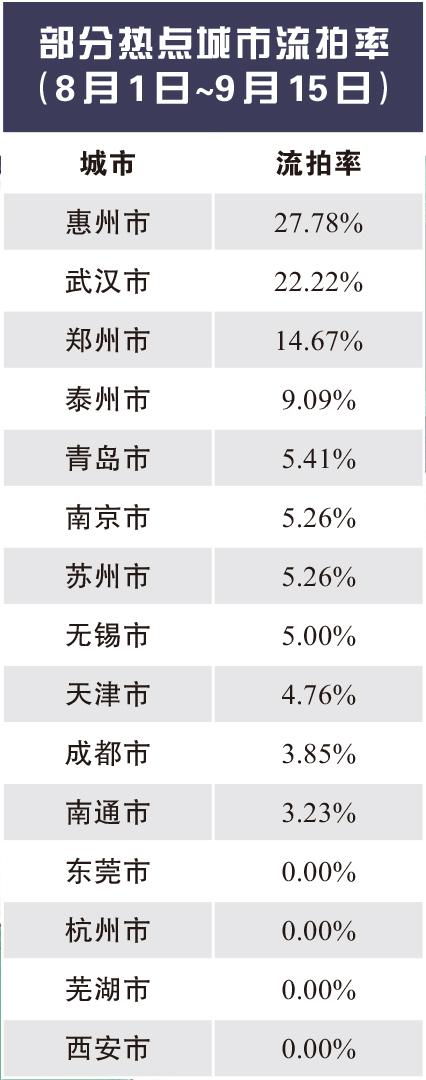 诸葛找房发布的数据显示,热点二线城市8月流拍率环比上涨1.98%。以武汉为例,今年4月,众多品牌房企涌入武汉,连两度流拍的“准地王”都被两大房企抢入囊中,仅4月23日和4月25日两天,武汉通过土地拍卖吸金就高达310亿元,超过2019年排名前列季度。但进入8月后,武汉仅成交两宗土地,平均溢价率为0,合计收金10.89亿元。9月3日,武汉挂牌出让5宗地块,总面积27.35万平方米、起拍总价48.95亿元。结果,当天两宗土地流拍,余下三宗揽金26亿元,仅达到预期收入的一半。同样的一幕也在浙江衢州、天津、成都、惠州、南京上演。