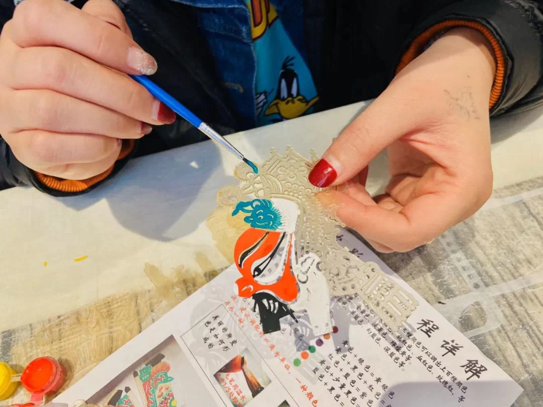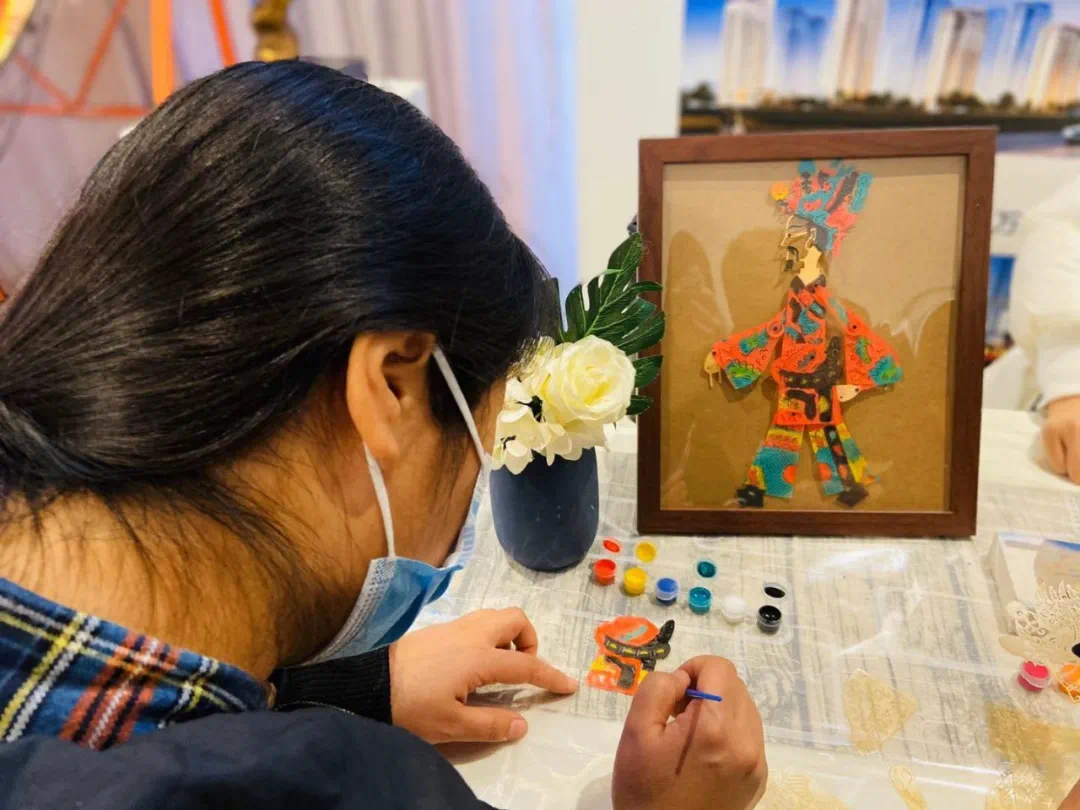 ▲皮影手作现场拾雅 精美的皮影脸谱,刀法简练明快,着色鲜明,蕴含着古朴厚重的民风情感,让大家感受到了民间艺术的文化魅力。