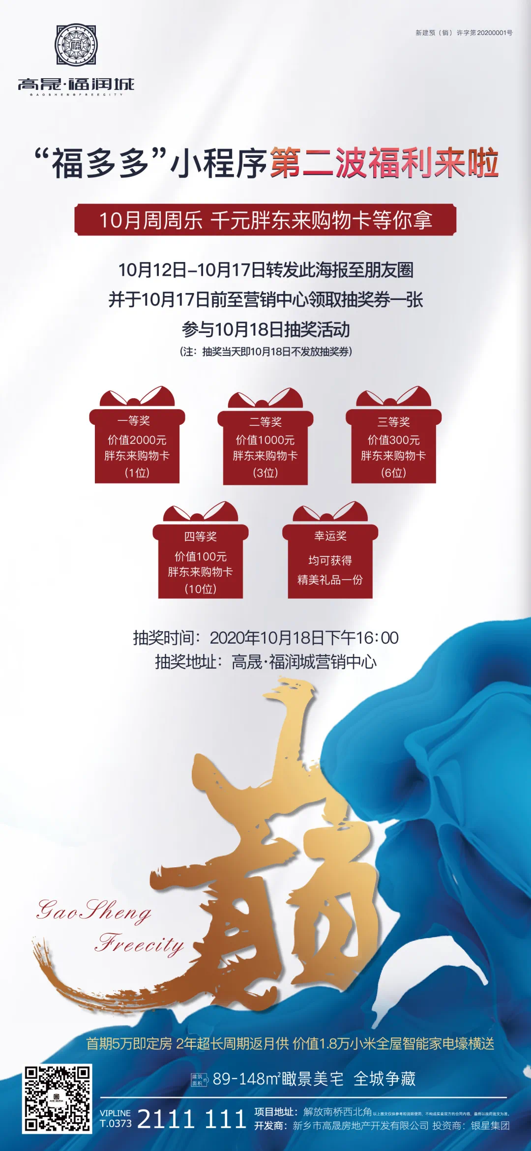 无空奖!无空奖!无空奖!全程无空奖,重磅真福利,自10月12日起转发指定海报至朋友圈,(或至公众号底部菜单获取),即可至高晟·福润城营销中心,免费领取抽奖券一张。参与10月18日、25日及11月1日抽奖活动,(抽奖当天不发放抽奖券,请大家提前领取)。10月17日前,转发此海报。