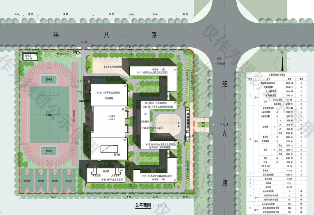 规划小学教学楼、中学教学楼,综合楼,图书馆,风雨操场,餐厅礼堂,宿舍。设置地上停车位23个,地下停车位55个;非机动车位972个。
