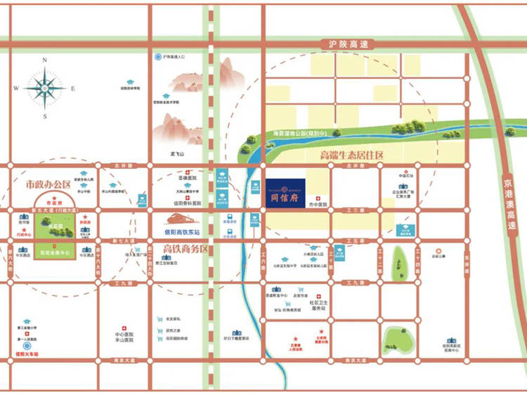 项目位于信阳市高新技术开发区,处于高铁新城经济圈。周边的交通网络是十分发达的,距离高铁东站5分钟;距离沪陕高速出入口大约只需要20分钟的车程,距离京港澳高速出入口只需要5分钟的车程,向西通过南京大道、新五、新七大道可以直接到达老城区和羊山新区,可谓是畅通无阻,目前8路公交直达项目,随着后期周边居民入住,更多公交线路也将到达这里,后期区域内将建成汽车东站,客运总站,让业主的出行更加方便、便捷,项目距离规划中的海营湿地公园也就5分钟路程,满足业主的休闲生活需求。