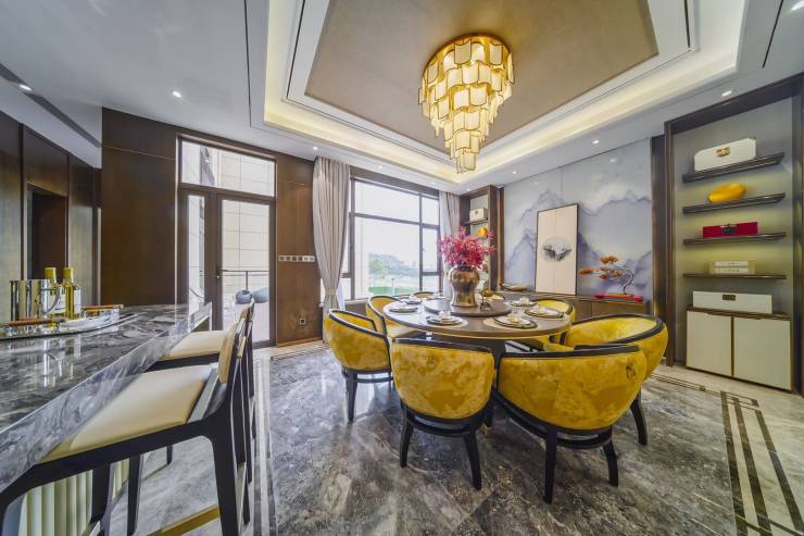 新中式园林风格,融入现代艺术元素,跌水+雕塑+景园(澜园、石园、梅园、弈园、苔园)一方青山,一池碧水,打造“沉浸式”园林设计。