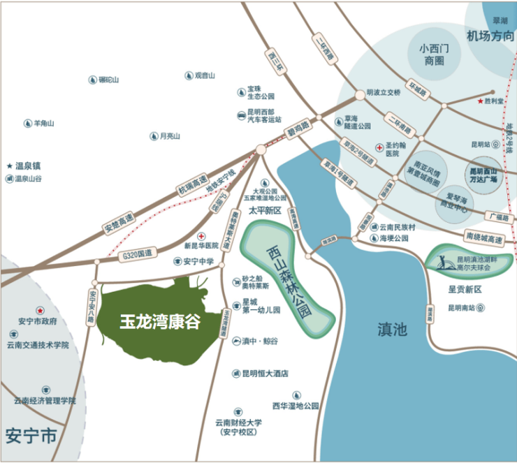 玉龙湾康谷位于昆明安宁市太平新城,距离昆明市中心24公里,距安宁市区7公里,属于昆明“30分钟经济圈”,同属滇中城市群“1小时经济圈”。交通可达性较强,交通便利,拥有城市近郊休闲的黄金距离。项目周围配套丰富,目前已运营的有砂之船·奥特莱斯、新昆华医院、安宁中学太平学校等一大批重点配套项目。