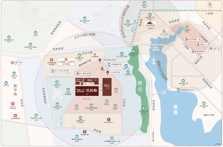 休闲:驱车半小时内,即可达光崀文艺村、玉龙湾公园、青鱼湾水上乐园、蝴蝶谷小人国以及安宁地热温泉群、西山、滇池大坝等昆明重点风景区,给您和家人的周末休闲带去众多的选择。