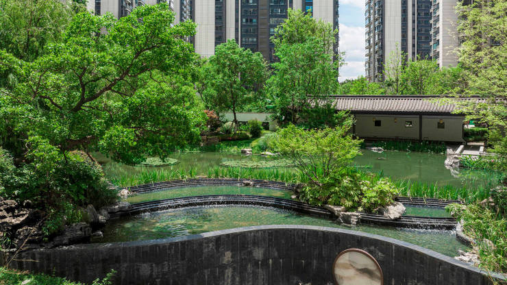 透过玻璃,中式园林的山水大观跃然眼前,引领您步入一个诗意盎然的世界