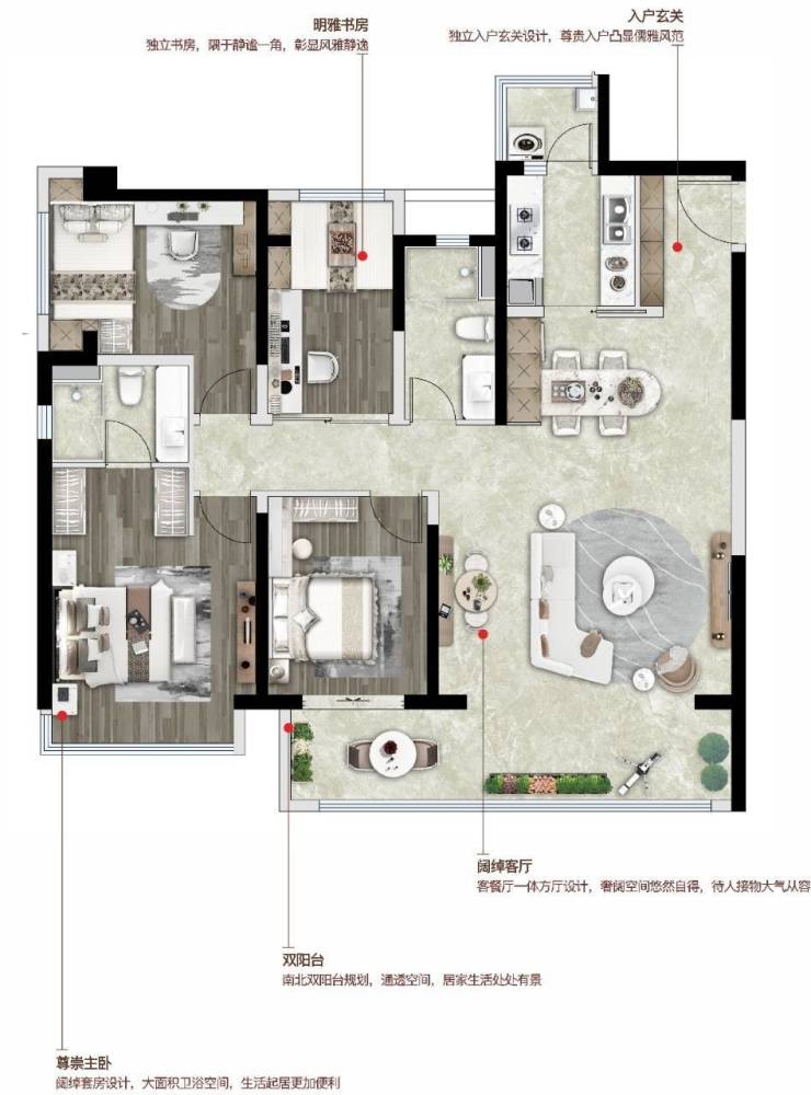 户型亮点:动静分区合理布局+约10.4米揽景阳台+独立入户玄关+双套房设计