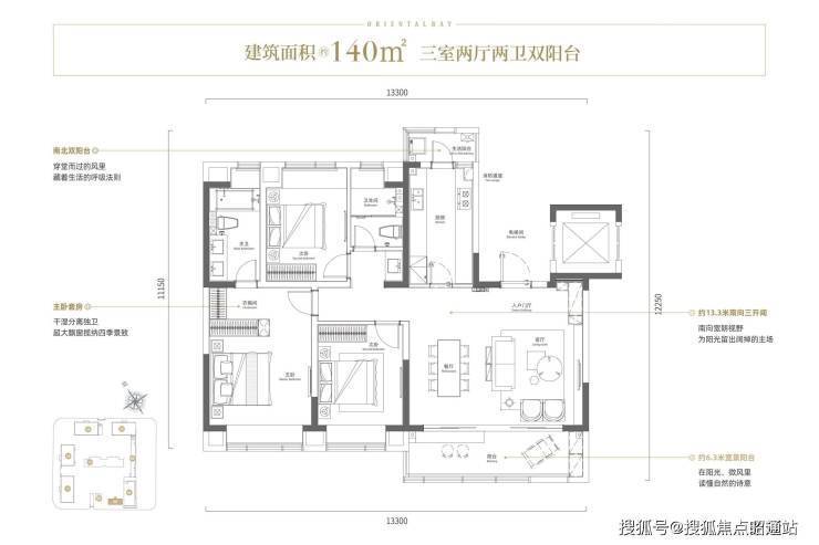 南北双阳台:将观景生活与居家储纳分置于南北两端,室内空间更加通透;