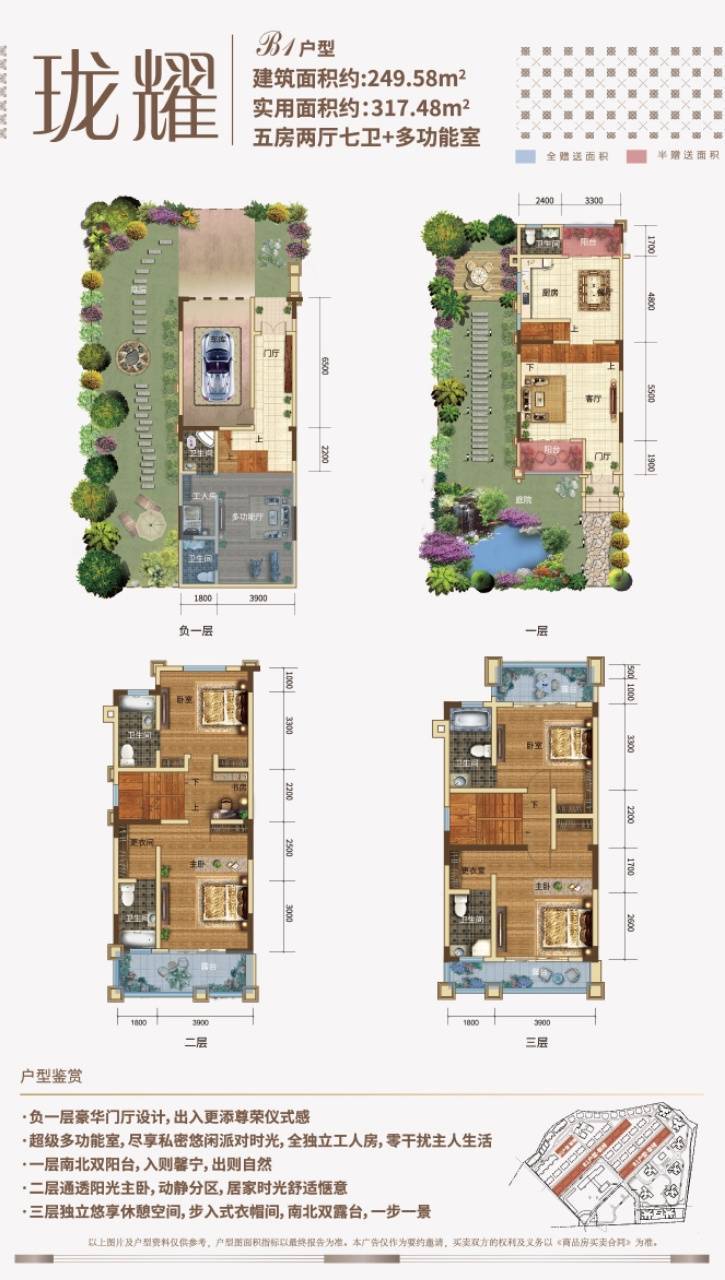 地块开发建设有52栋、196套法式主题别墅,由176套联排和20套双拼产品组成;联排产品以四联排为主,地下1层地上3层,带有前后花园和车库,四联排主力户型面积229、249㎡;双拼户型面积291㎡。产品除了前后花园外,带有电梯入户,同样是地下1层地上3层的结构。