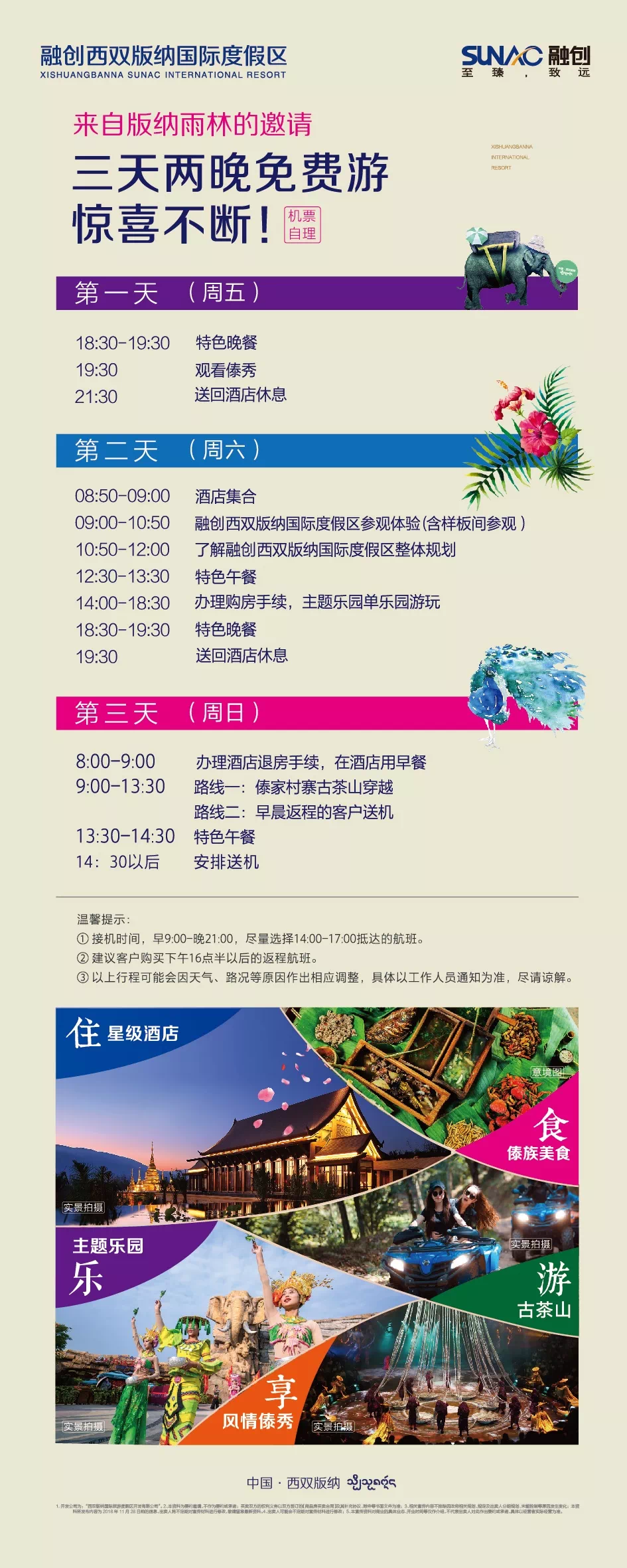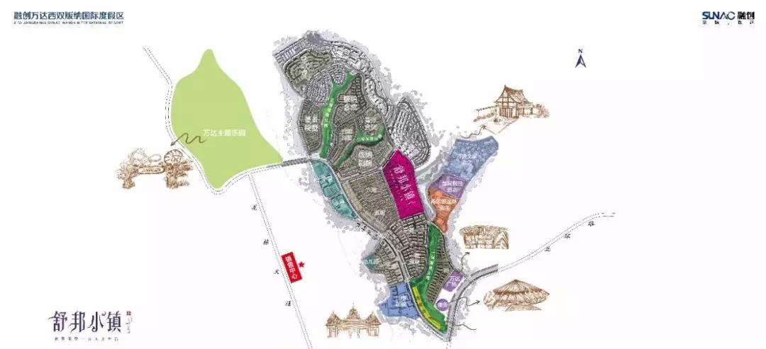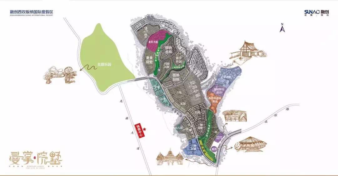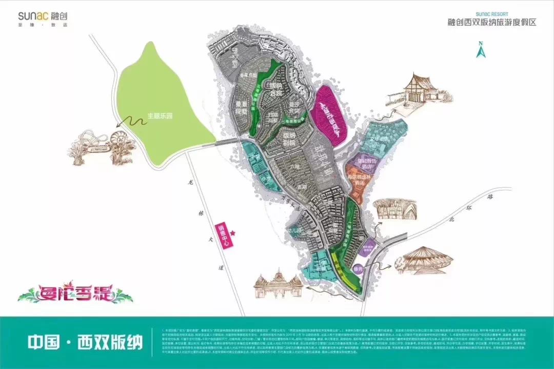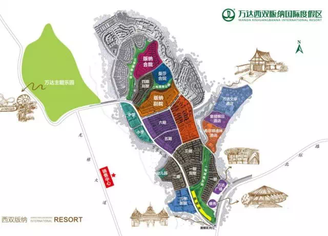 【主题乐园】:主题公园占地约61公顷,由高级设计公司 formed公司担纲设计,设计为具有傣族文化特色的主题公园,打造为西双版纳乃至整个西南地区的文化旅游热点。