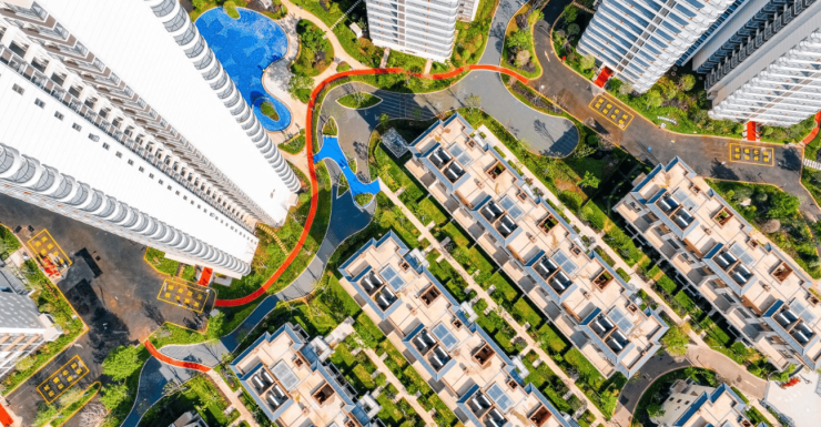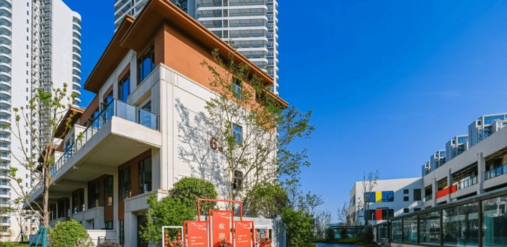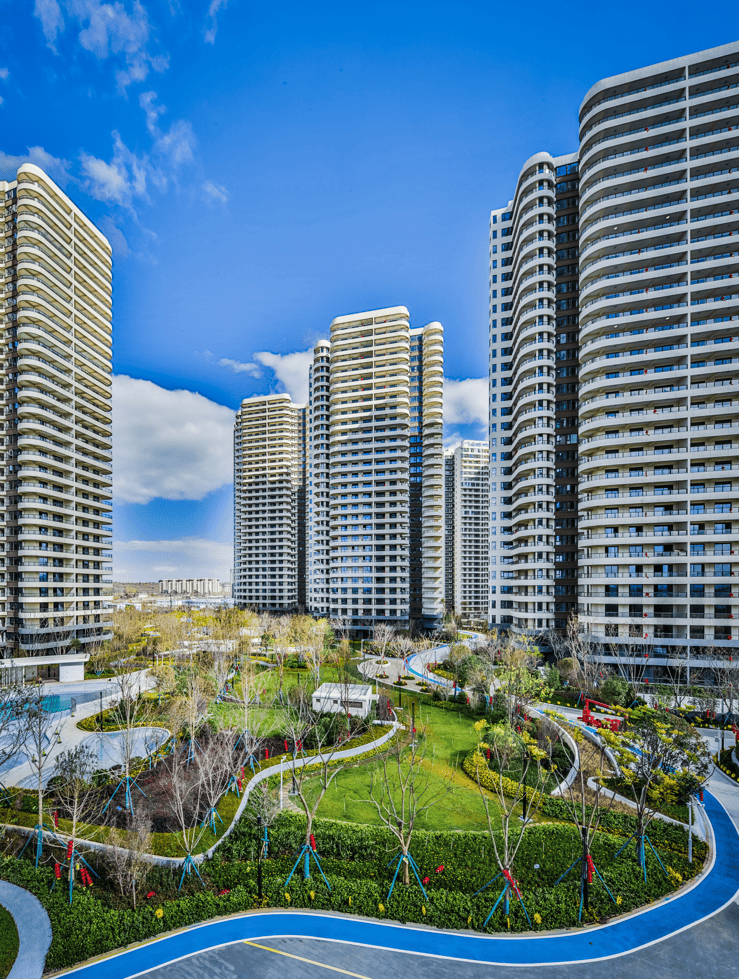 由 6 栋高层住宅,3 栋商业/配套组成,从人居舒适度出发,摒弃了市场上大多数楼盘采用的行列式楼体排布,而是采用了围合式的楼体排布,从而使整个项目达到了建筑密度更小,楼栋间距更大,视野更加开阔、通透,随着中庭面积的扩大,有更多空间设置绿地景观,提升小区自然生态环境,业主也可享有更大的户外活动空间,同时让业主有更好的居住体验。