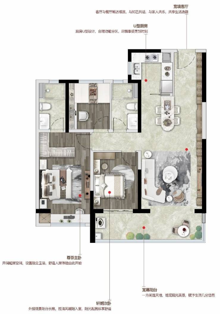 户型亮点:格局方正+约6.5米瞰景阳台+U型厨房紧邻餐厅+主卧套间设计