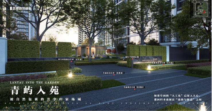 •东大门入户从公园里归家(东边规划约4000方市政景观公园),采用高绿篱及氛围灯饰形成被自然包裹的归家场域,给人一种温馨而又高级的居住环境。
