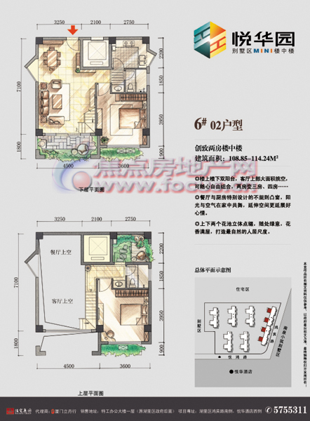 悦华园由6幢多层与小高层建筑组成,一期推出的是其中的1#、2#、3#和6#。其中1#、2#、3#为多层建筑,6#为带电梯的小高层建筑。63---115㎡的楼中楼,客厅餐厅挑高5.6米,给业主的使用面积较大可增加30-45㎡,“买2房,享4房”。小区位处别墅区板块之中,园林景观优美,绿意盎然。
