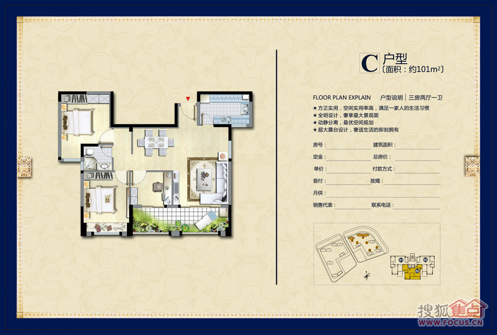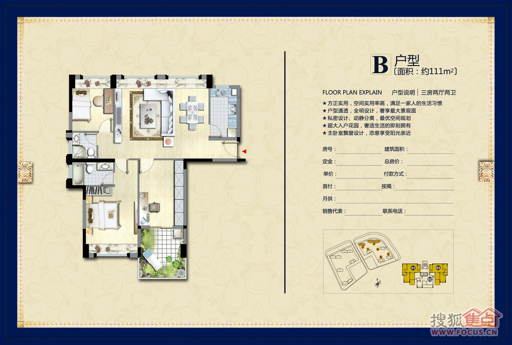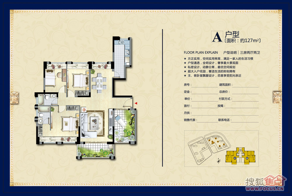 以两房、三房为主力户型,另有部分四房、五房。由1栋17层和5栋18跃19层高层组成,规划总户数338户,停车位243个。首层全部架空增加了庭院景观的连续性,特别是减少了马路的噪音及汽车尾气污染对住宅的影响,首层独立门厅的设置提升了住宅的品质。1号楼一梯两户,共17层,户型为127平米三房(送超大入户花园,可改四房);2号楼一梯三户,共18跃19层,2-17层东南北和西南北户型为110-110平米三房,朝南为户型为101平米三房。18跃19层为楼中楼127平米;3号楼一梯三户,两个梯位,共18跃19层,2-17层东南北、西南北和中间套户型为110-110平米三房,朝南为101平米三房。18跃19层为楼中楼127平米;4-6号楼一梯三户,共18跃19层,2-17层东南北和西南北为110-110平米三房(送超大入户花园),朝南为91平米两房,18跃19层为楼中楼123平米。项目除2房91平米的户型,其余户型均可赠送两个红印户口。