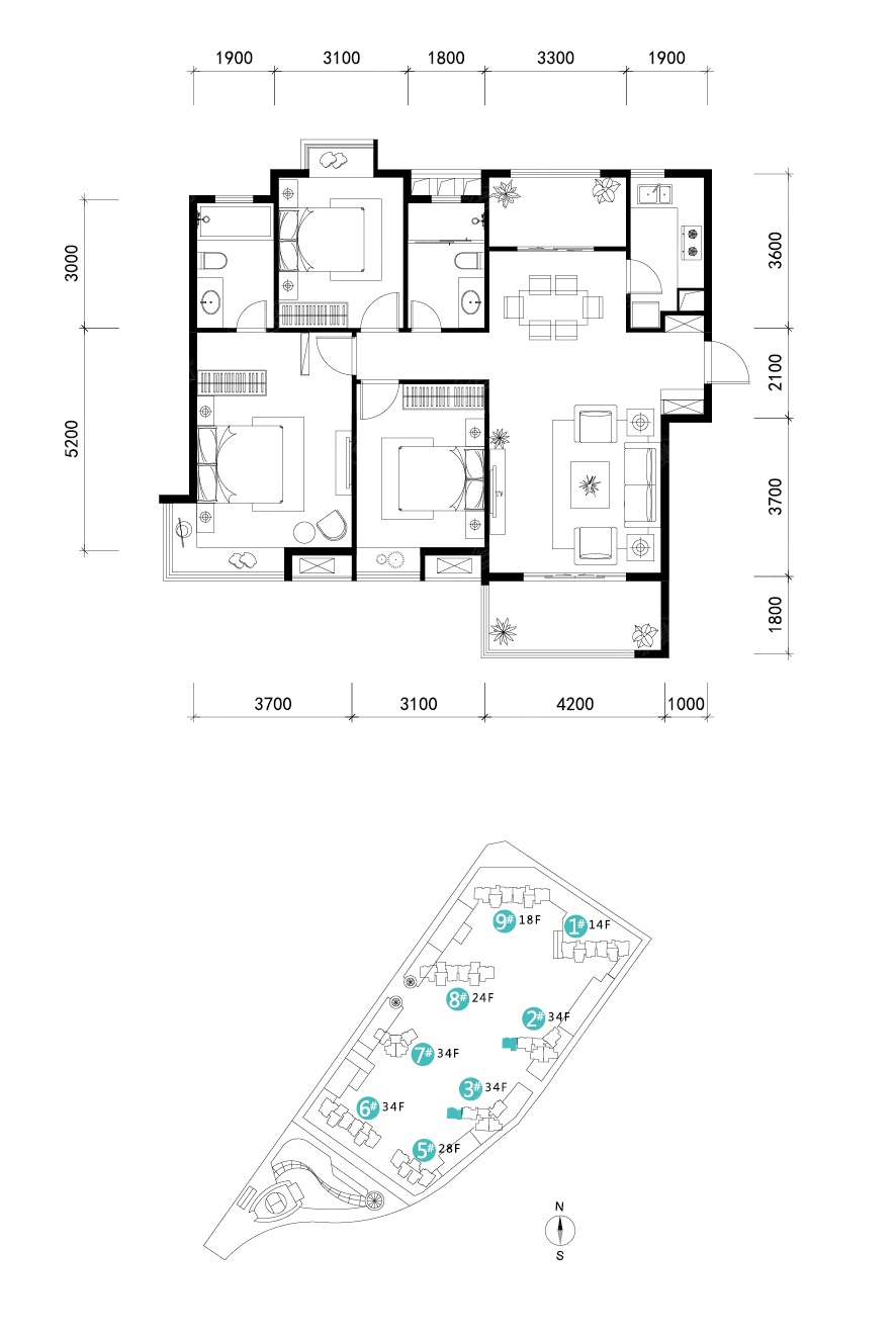 3室2厅2卫-1#楼N户型3房2厅2卫133㎡