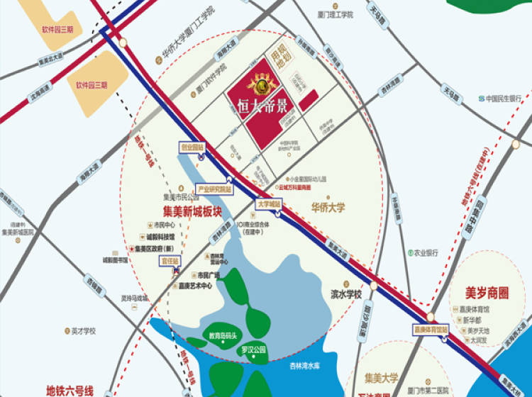 厦门恒大帝景,地处集美新城东部,交通便捷,生活配套醇熟。项目总建约21万㎡,以阔景御湖大城为规划理念,欧式建筑为设计理念采用围合式布局,打造近4万㎡园林,中庭规划大面积园林、多处水景,高达130米楼间距,栋栋享阳光,户户瞰园景,绿化率近40%;社区配备恒大全心全意的服务:约2000㎡休闲双会所,设内外双泳池、多元休闲中心等,并礼聘金碧物业全程管理。项目规划三房和四房户型,匹配一步到位置业的不同需求,并含品牌装修,重塑居者美好生活。