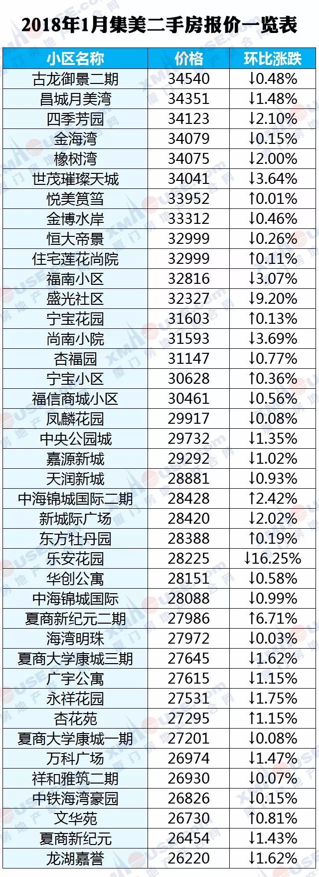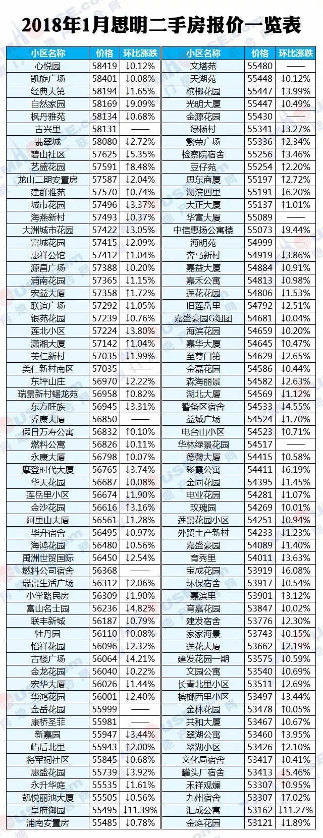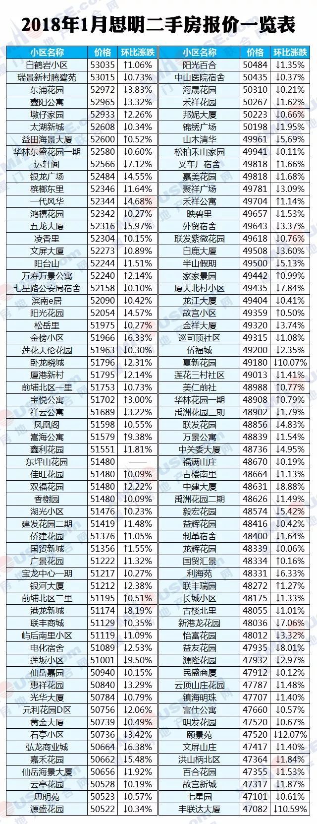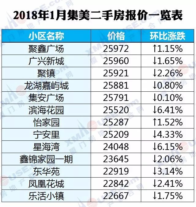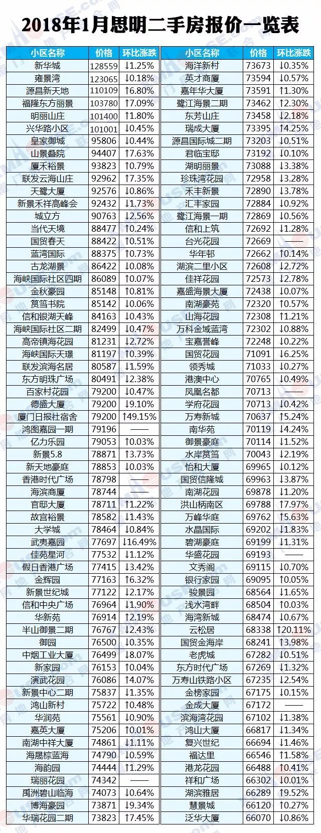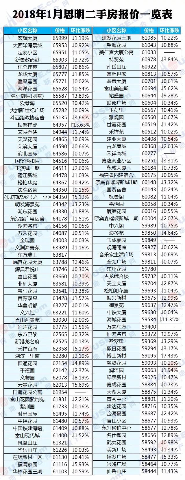 每个人都可以有自己的市场判断,然而数据却是最理性的。2018年1月厦门全市1100个热门小区二手房价格挂牌价统计出炉: