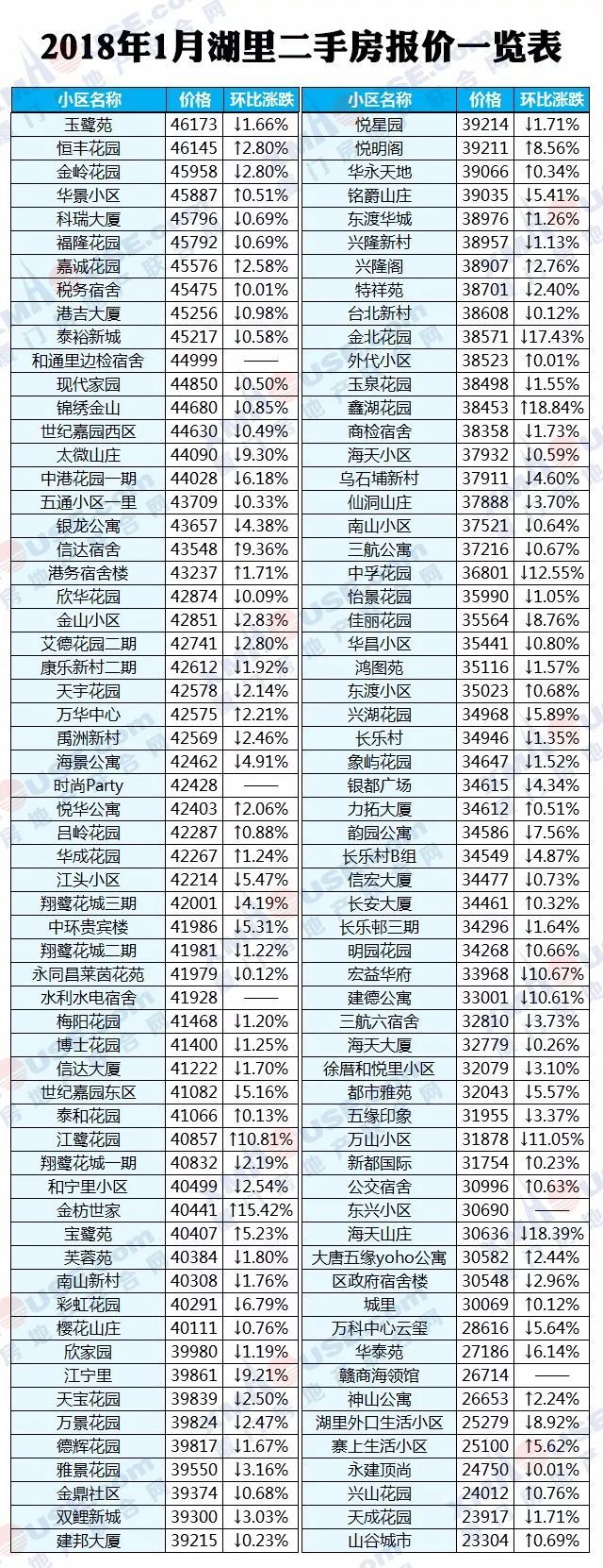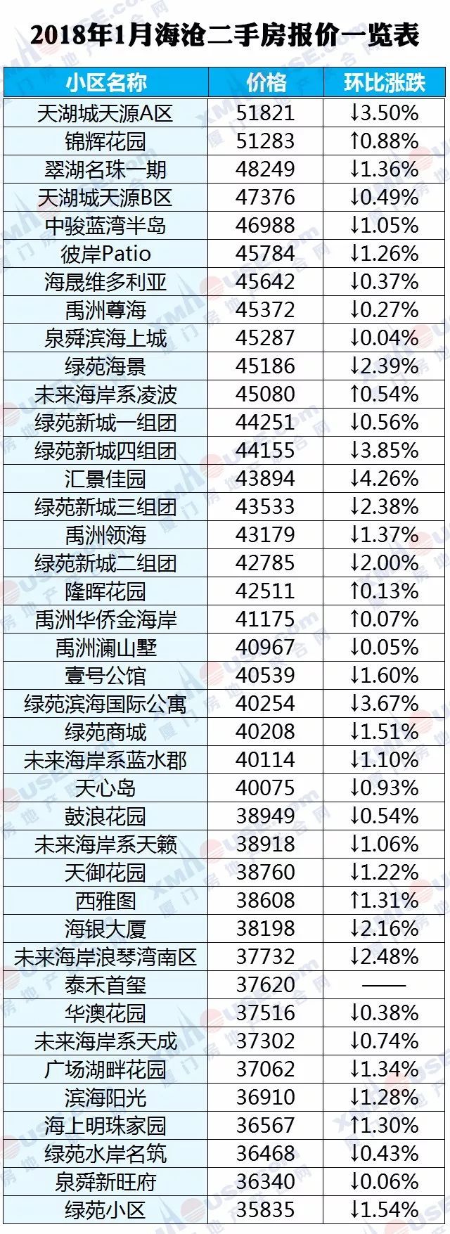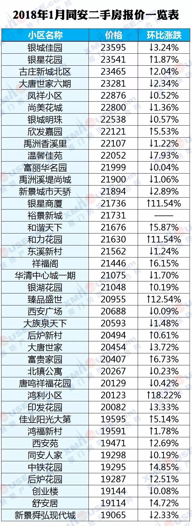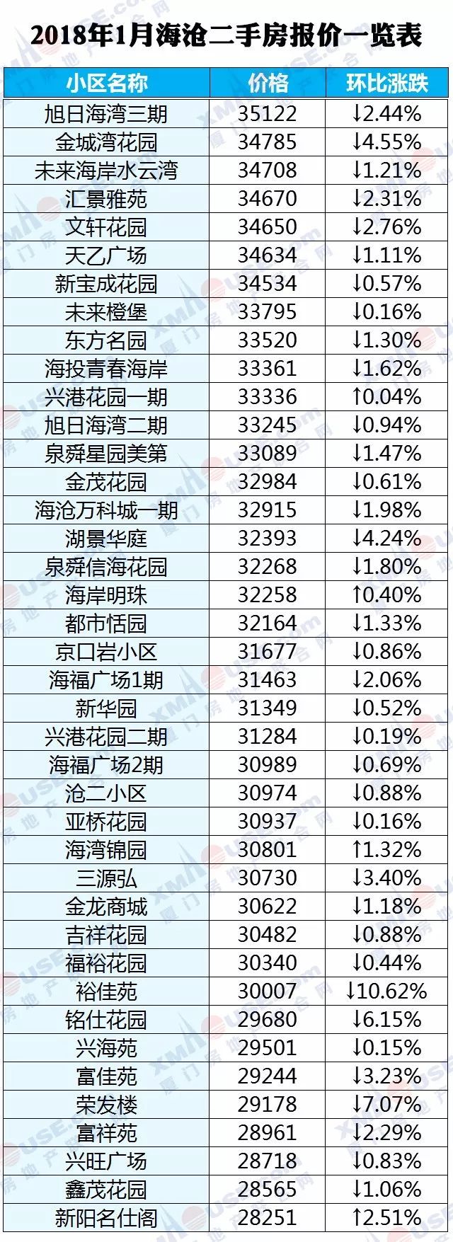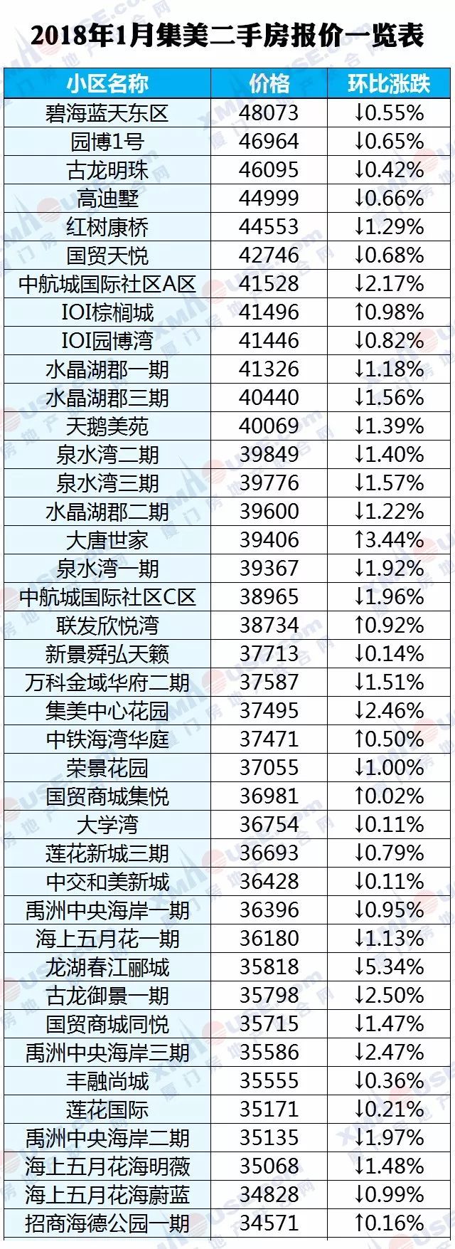 每个人都可以有自己的市场判断,然而数据却是最理性的。2018年1月厦门全市1100个热门小区二手房价格挂牌价统计出炉: