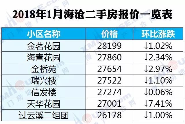 三、海沧共计86个楼盘,其中环比上涨的仅有10个;下跌的达到76个,占比88.4%;