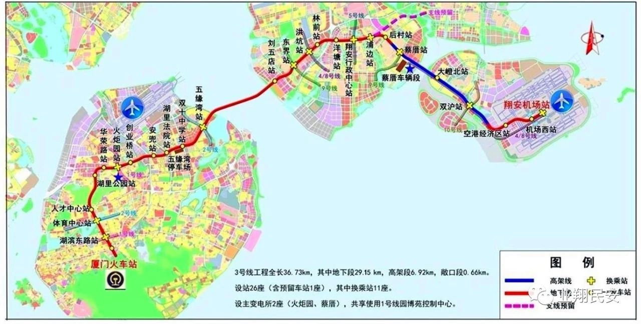 厦门地铁3号线全长36.72公里,是连接厦门本岛与翔安东部的西南-东北向骨干线。线路起于厦门火车站,终于厦门(翔安)新机场,构建了厦门本岛至翔安片区的快速跨海连接通道。轨道3号线(火车站至蔡厝段)力争2020年建成。