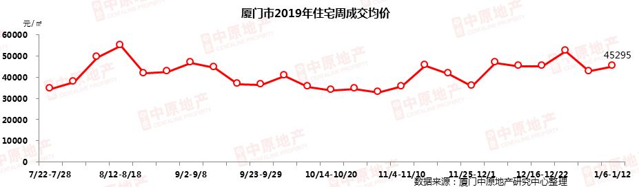 上周厦门新房住宅成交共成交203套,日均成交为29套,周成交面积2.47万㎡,环比下跌28%;成交均价45295元/㎡,环比上涨5.6%,岛内多个项目助力价格上涨。
