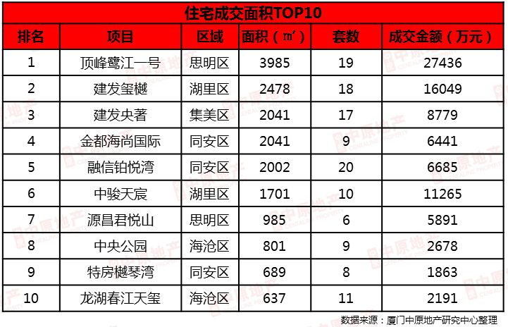 其中顶峰鹭江一号居面积与金额双榜首,建发玺樾紧随其后。